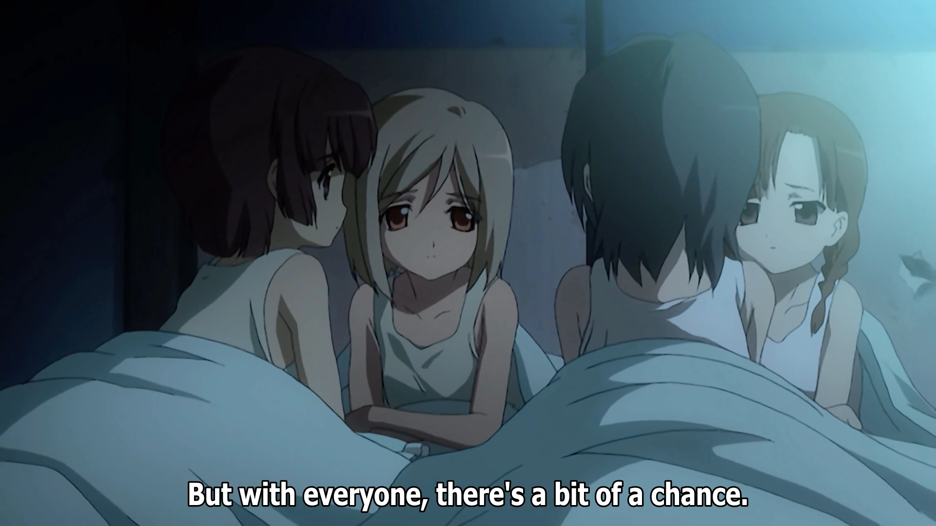Eriko explains that in the past there was a group escape. Miyoko asks if this is really true, and Eriko responds that the orphanage keeps it secret since only one person was caught. They succeeded since they all scattered. Tomomi is scared about being caught; Eriko asks her how much longer she intends to stay. She asks Miyoko if she will go with her. Miyoko asks her if she is sure they can escape. Eriko cannot guarantee success, but admits that if more people go with her, her chances of escape are higher than if she went alone.