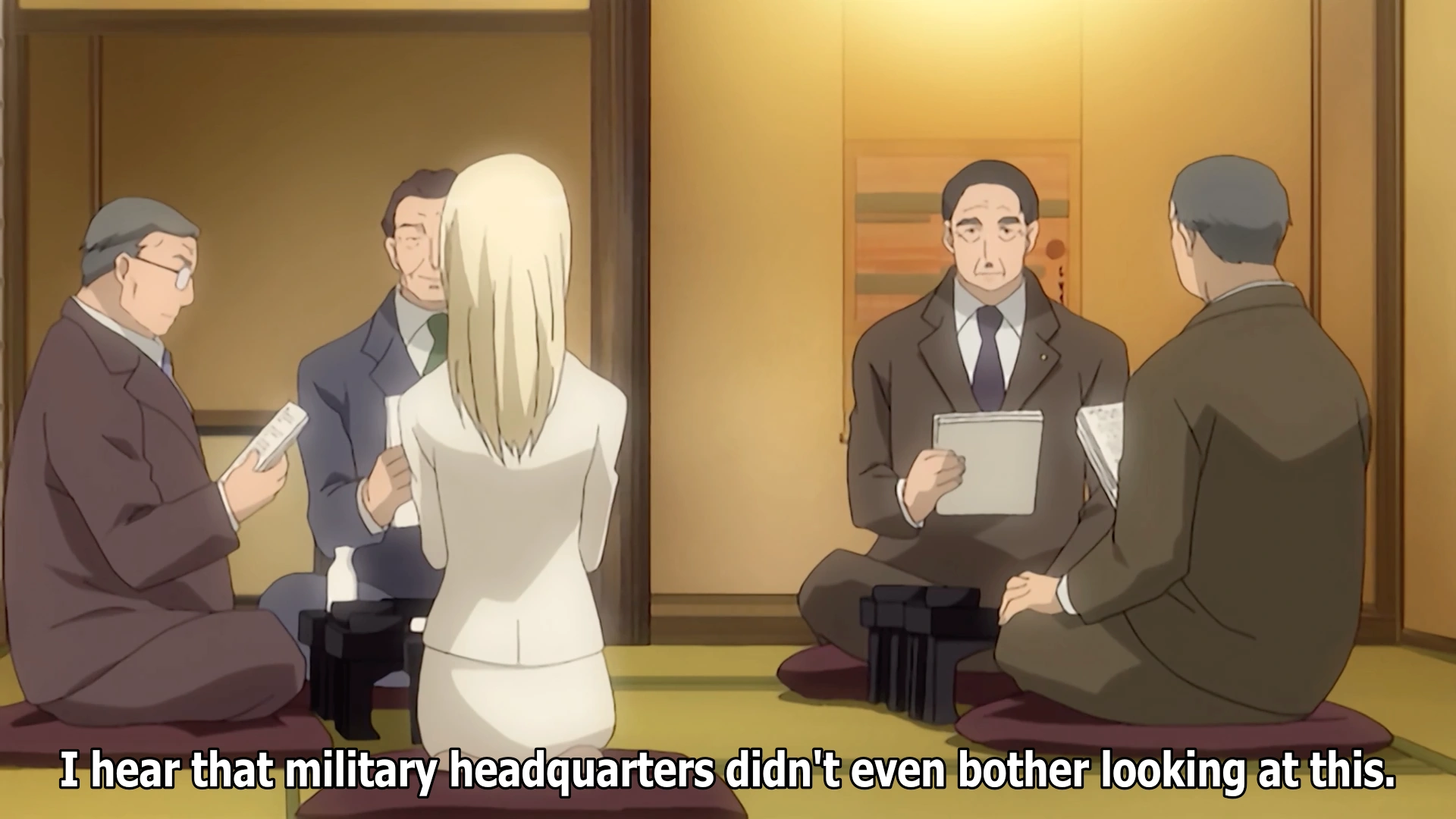 Another with a small mustache last popular in Germany, 1944, laments that the military refused to look at it. Another with a gold tie adds that since no one heard of it, the "GHQ," or Supreme Command of the Allied Powers, never investigated it. Another compliments Takano that it seems as if Takano Hifumi possessed her to complete his research. She laughs covering her mouth while confessing that she feels she has a strange tie to the study. The man with a gold tie eminds her that the purpose of the research is not to gain a biological weapon but to create countermeasures to it. The man with the mustache adds that the board of director have conditions. First, the authority for research must be in the hands of an exceptional expert in the field. Takano bristles slightly, but she tries to politely ask who knows more about the subject that herself. The men with the mustache and with the gold tie reassure her that they will arrange it for her benefit. The man with the gold tie explains that he has the power to select that person, and he will simply pick someone she can easily work with.