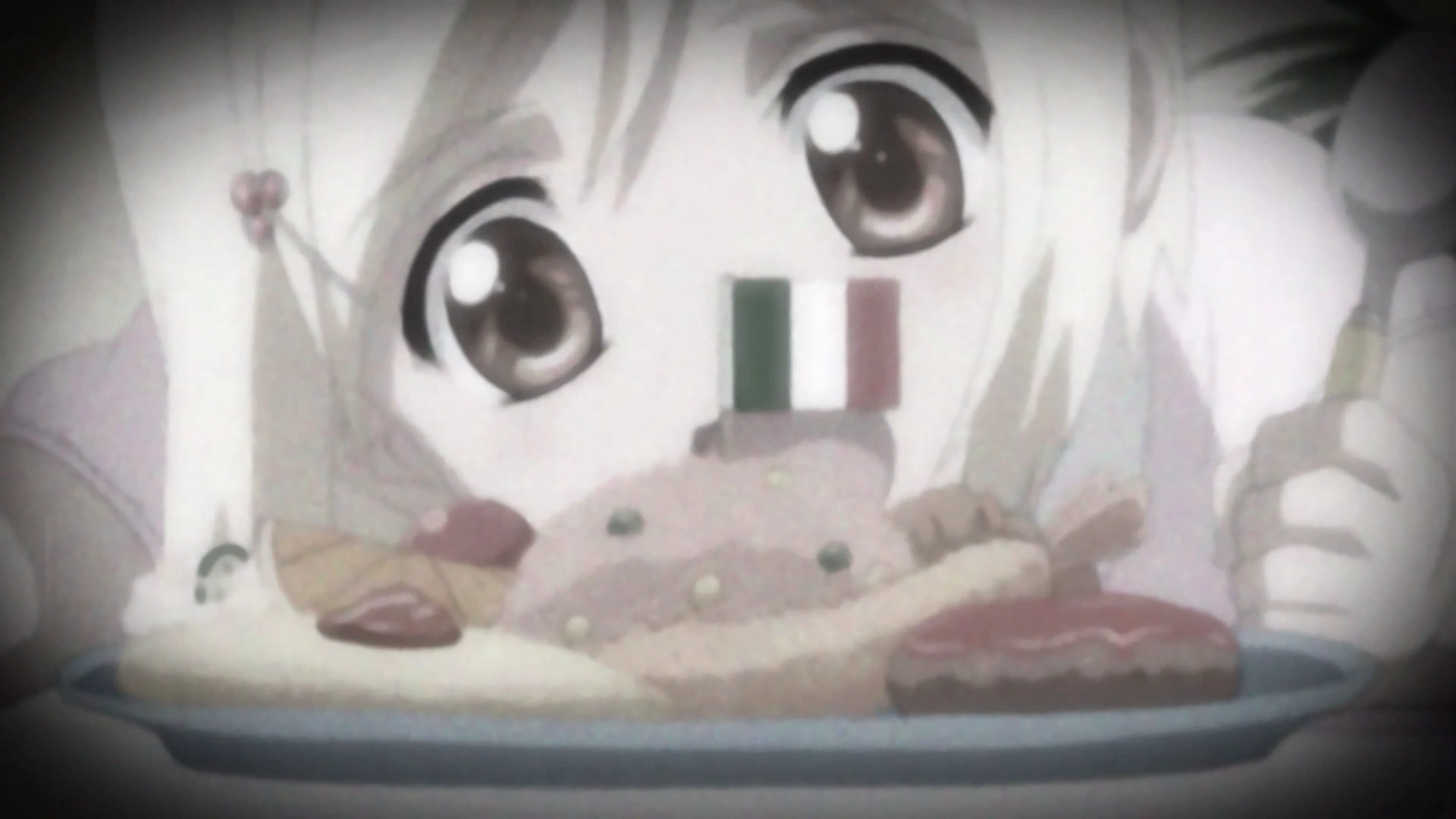 She has only one shoe and slips and falls down the side, losing her other shoe. The rain picks up. As it falls on her face, she cries to her mother. In a flashback depicted as an old film playing, Miyoko sees a large department store. Inside, she happily receives a meal with a small flag stuck in the rice.