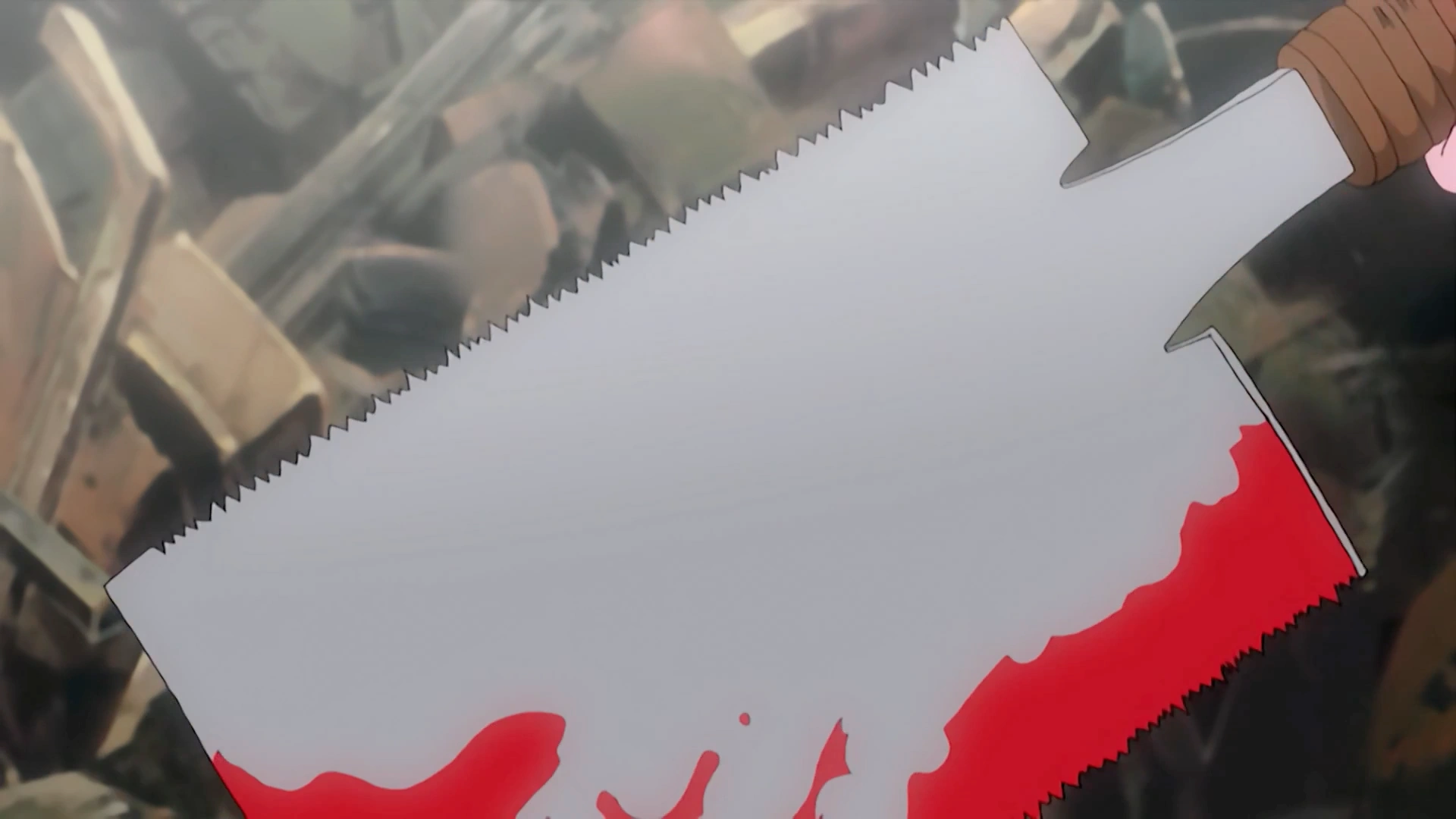 Rena smiles and says, "a little," as the scene shifts to her dressed in her black track suit with heavy gloves in the dump. She saws at a body that is on plastic, with her foot stepping on a hand, until something makes a sick and wet snapping sound. A few flashes of the parts reveal Rina's feet and Teppei's arm near part of his head.