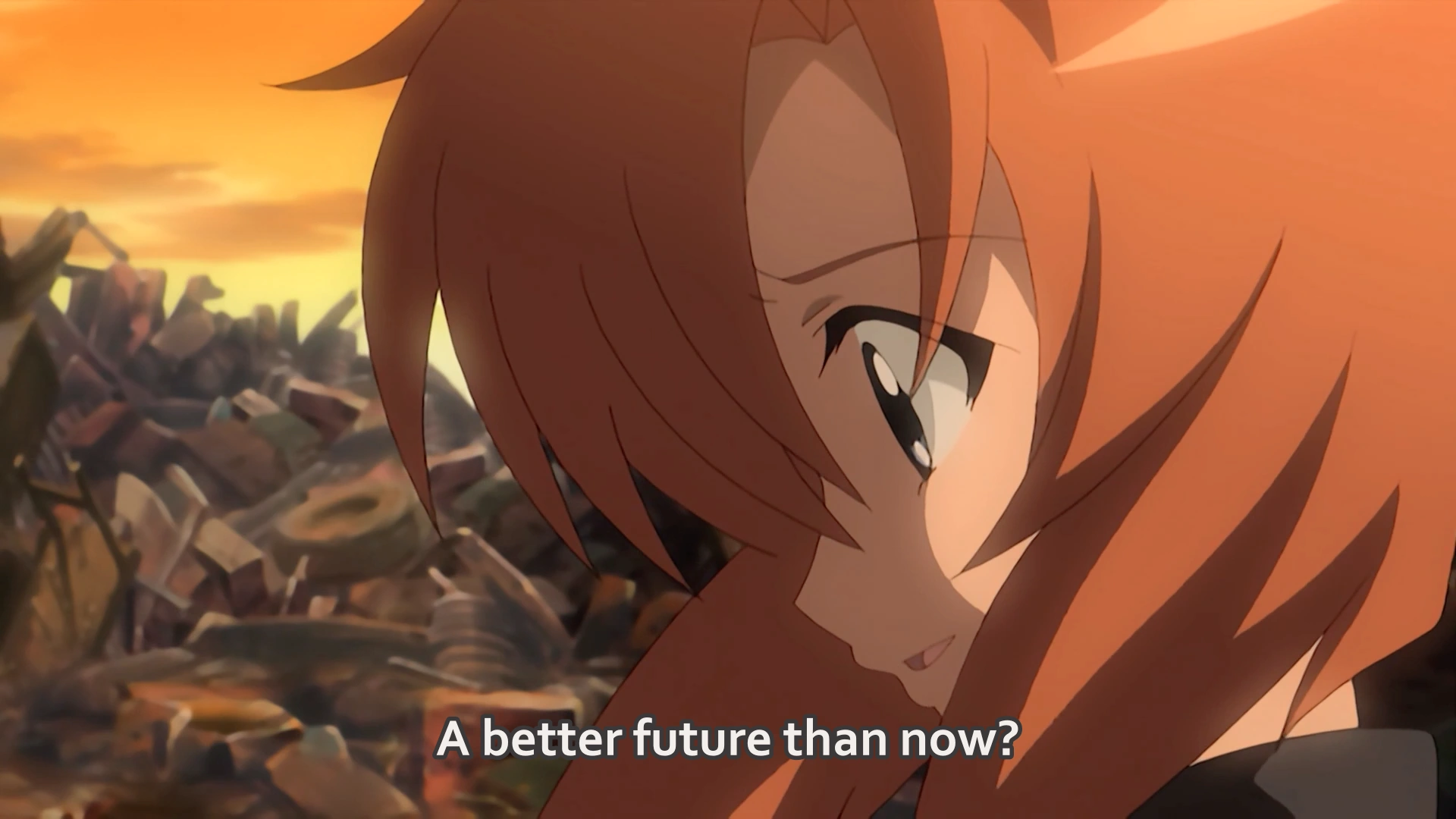 This surprises Mion. He continues that if she told them, while they may not have been able to come up with the best solution, "I believe we could've reached a better future than now." Rena smiles, repeats his statement as a question, then replies with a bit of a laugh that, "There is no such thing." She declares this "the best future." Keiichi responds with
