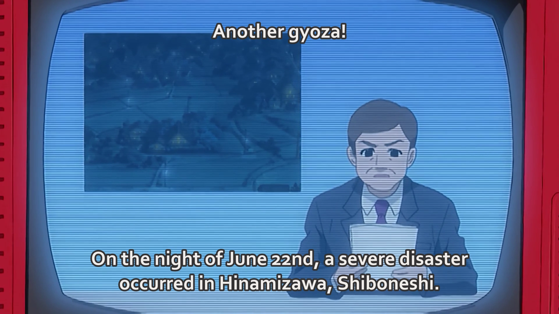 The reporter then presents another report on "the disaster." A customer remarks on the tragedy of dying in one's sleep to a waitress who replies, "so sad!" As he orders another gyōza and a beer, the newsreader continues that on the night of June 22, "a severe disaster occurred in Hinamizawa, . ." Poisonous volcanic gas erupted which flowed into the village, killing everyone. "The current confirmed death toll is over a thousand." The newsreader is handed another set of papers, and he announces that there is one confirmed survivor: "Maebara Keiichi, a Hinamizawa resident." Found in respiratory distress, Keiichi is now located in a local general hospital and should survive.