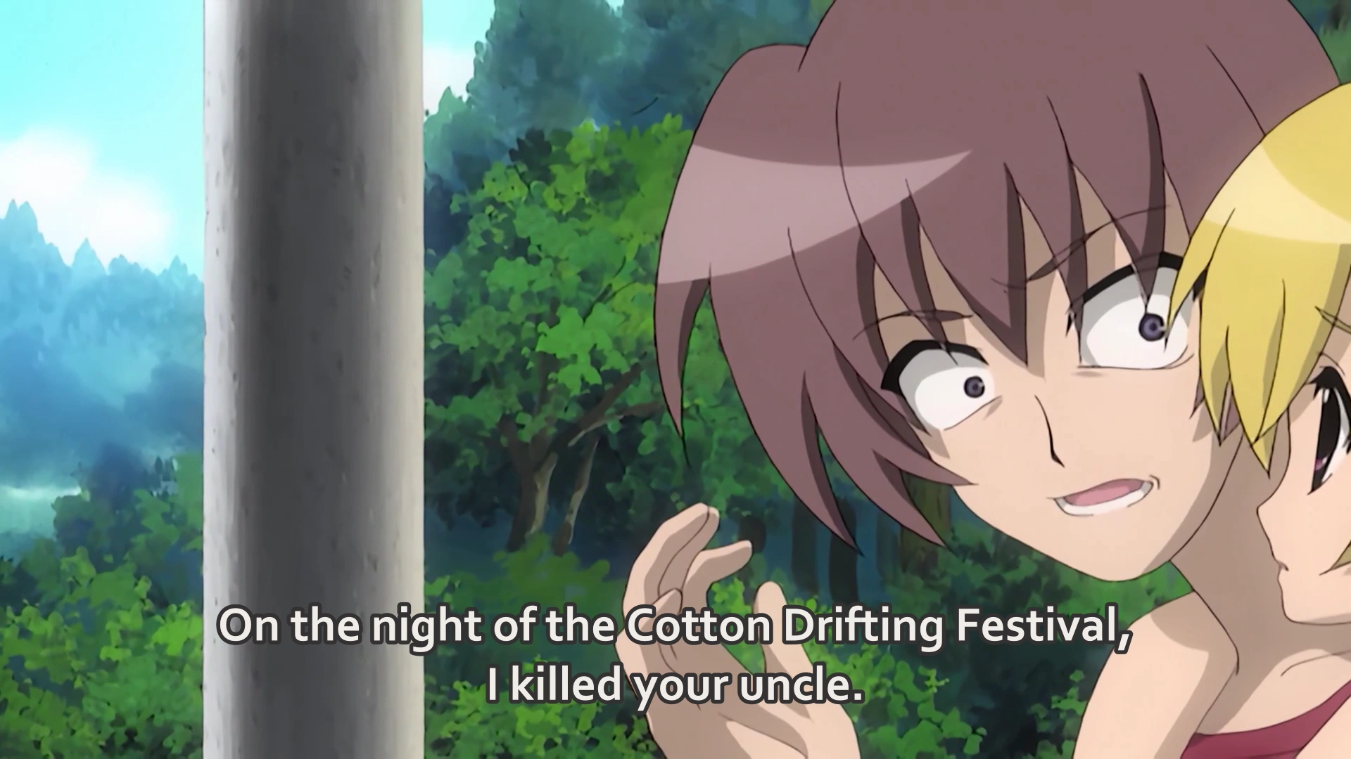 Listening, Keiichi does not understand, but Satoko approaches him to ask what is going on. He explains that Irie apparently committed suicide. Tears form in Satoko's eyes. She repeats that it is a "lie," without conviction. When Keiichi apologizes, Satoko asks him why he is apologizing. Keiichi confesses that he cursed Irie as he inwardly flashes back to his time in the Irie Clinic the previous day. Satoko declares that it is not his nor anyone else's fault. Drying her tears, she then announces that she does not wish to remain naked in a towel for very long and wishes some clothes.
