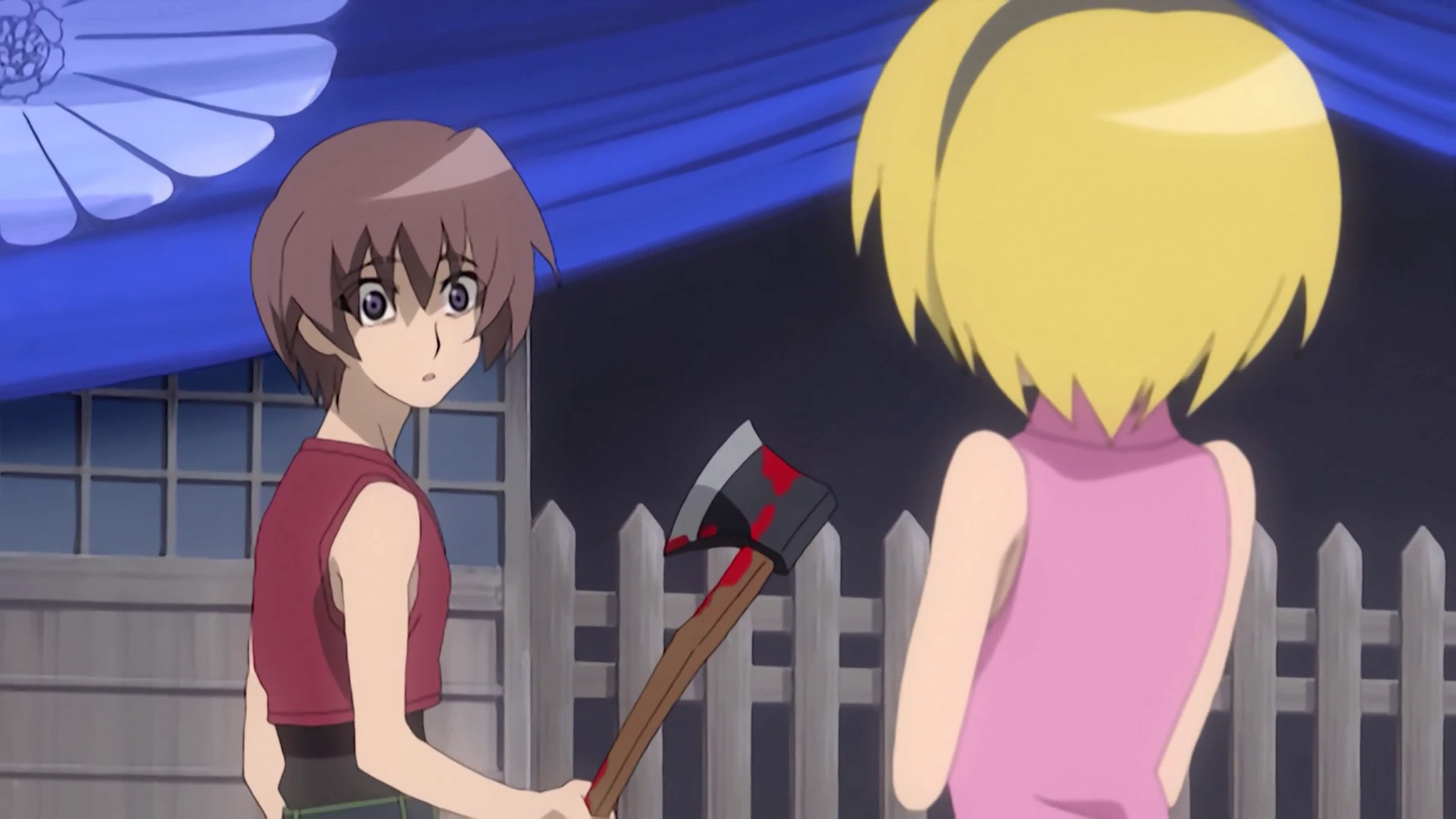 He suddenly rises when he realizes that means Teppei is still with Satoko. He opens a tools shed and chooses an axe as he vows that, no matter how many times it takes, he will kill him.