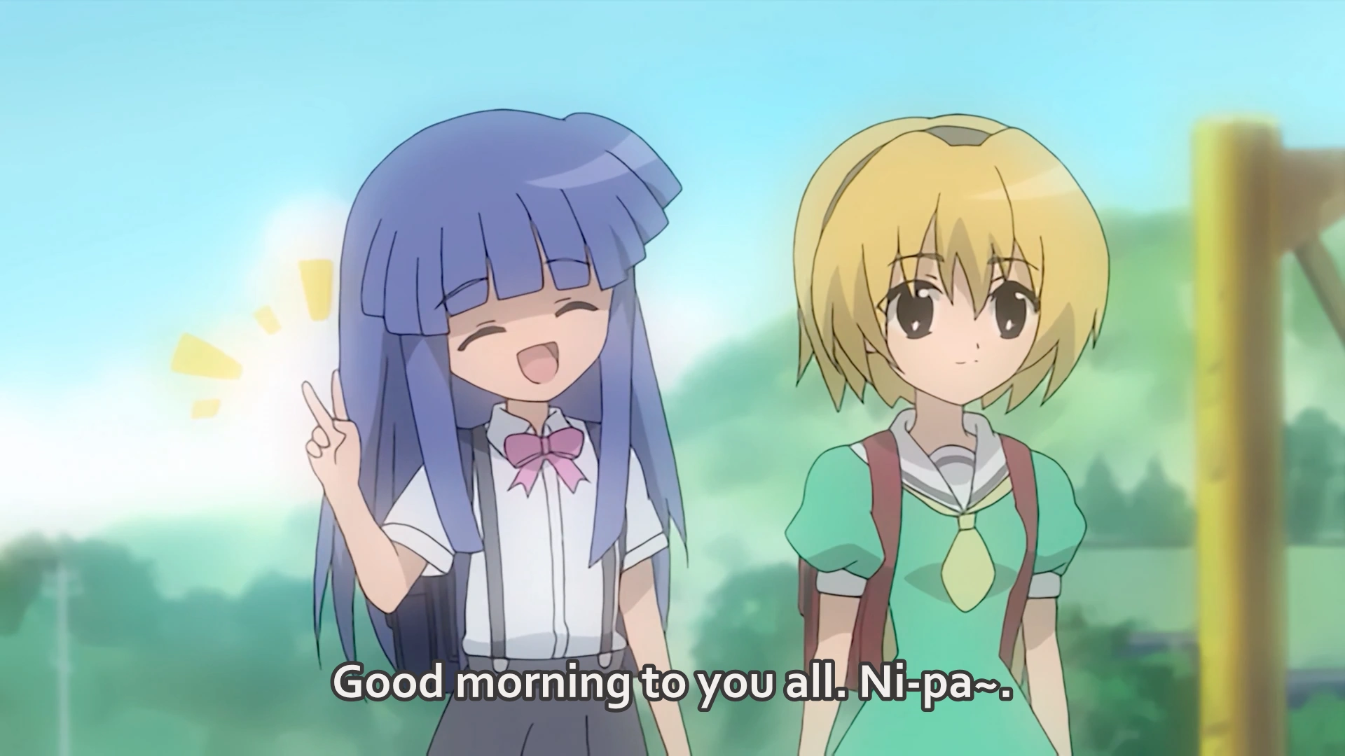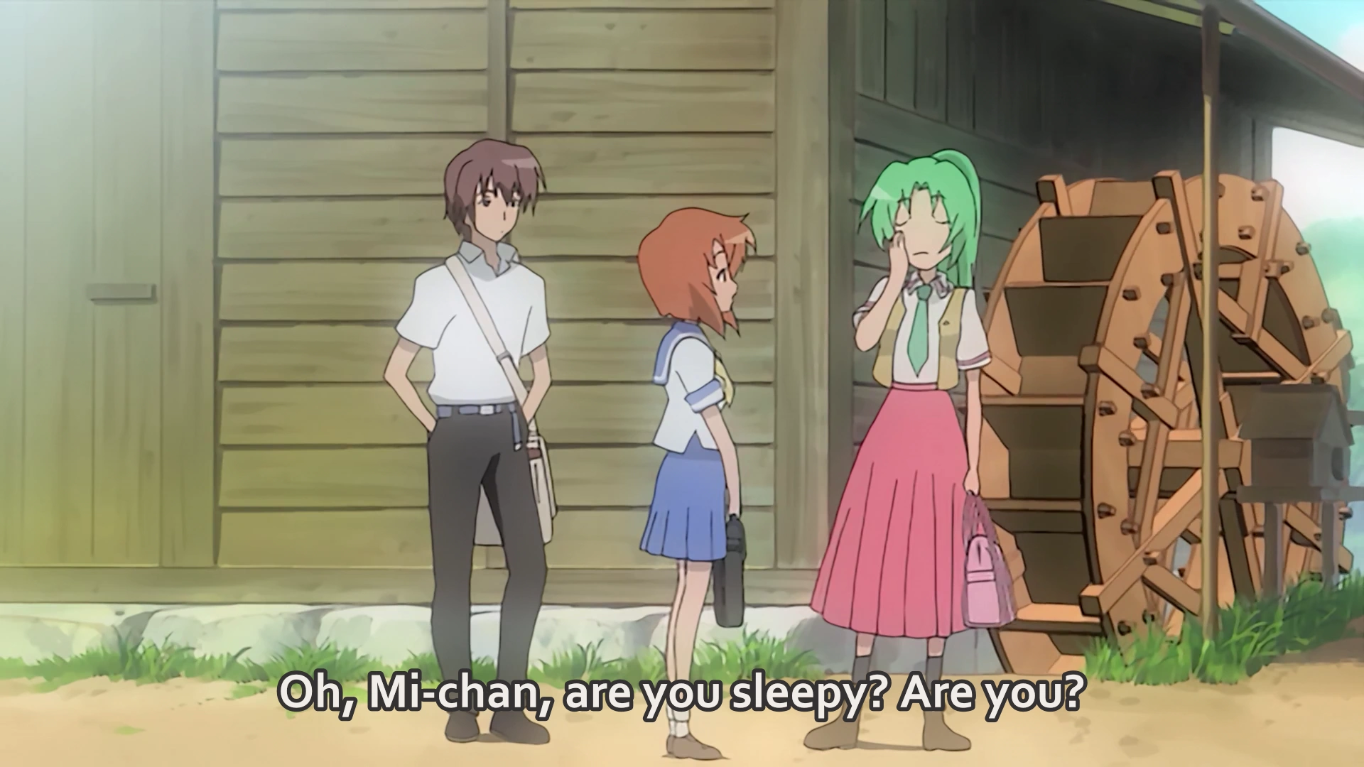 Rika returns their greetings with her "Nipaa~!" which send Rena immediately into Cute Mode. All laugh and make their way into school save Shion. She watches Rika. Inwardly, she recognizes Furude Rika as the last survivor of the Furude family and its current head. Shion find it hard to believe that a child "never invited to meetings" would carry out Oyashiro-sama's Curse "as had of one of the great families."