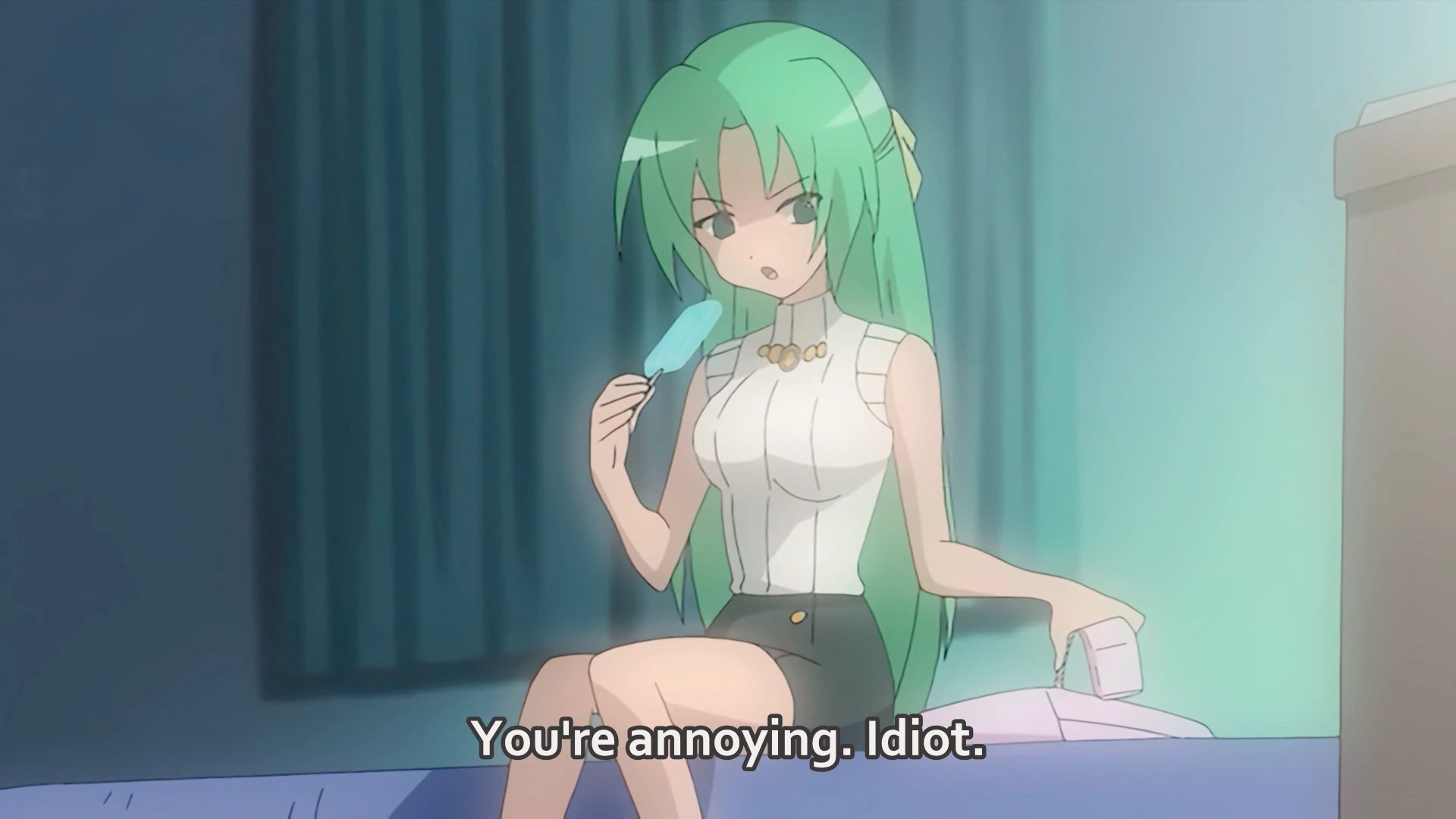 As she prepares to eat a popsicle, she replies to the phone: "You're annoying. Idiot ( 馬鹿・baka). It melted thanks to you."