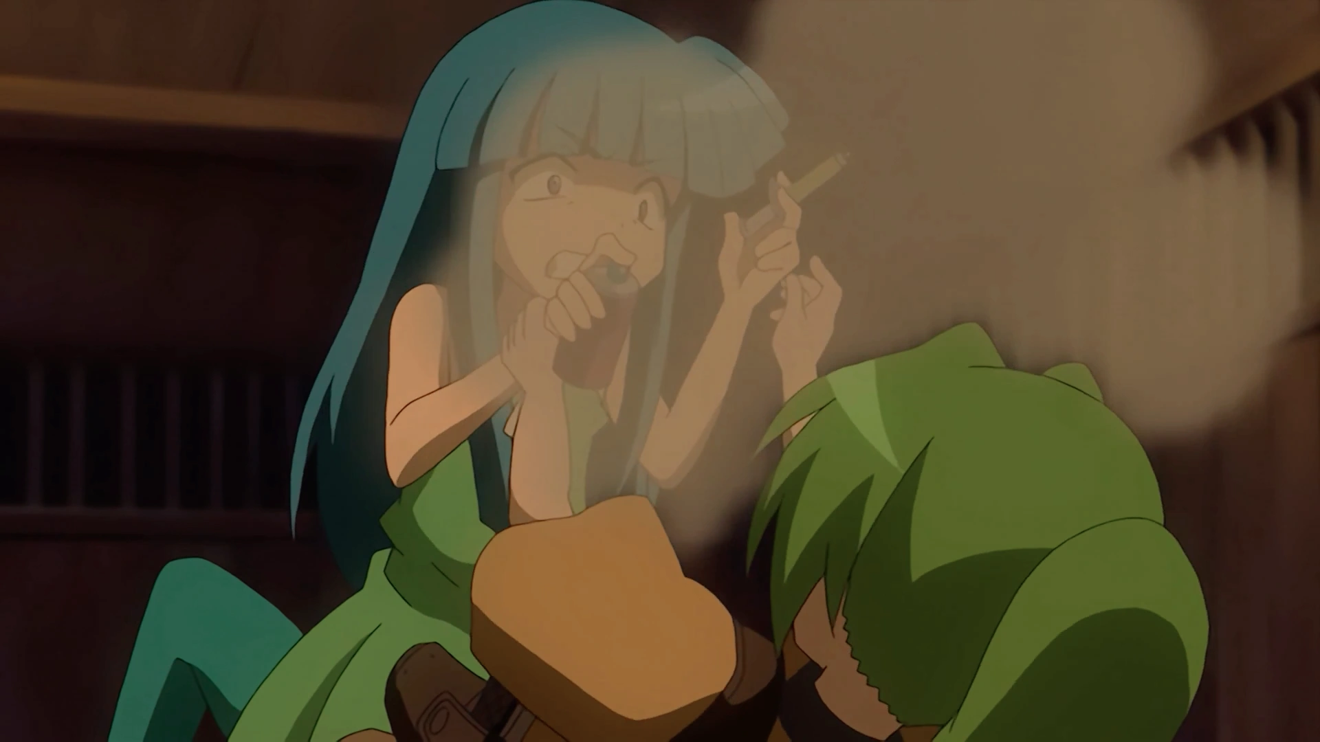 Shion grabs her hands which causes the spray can to release again. The cloud affects Rika which allows Shion to toss her aside.