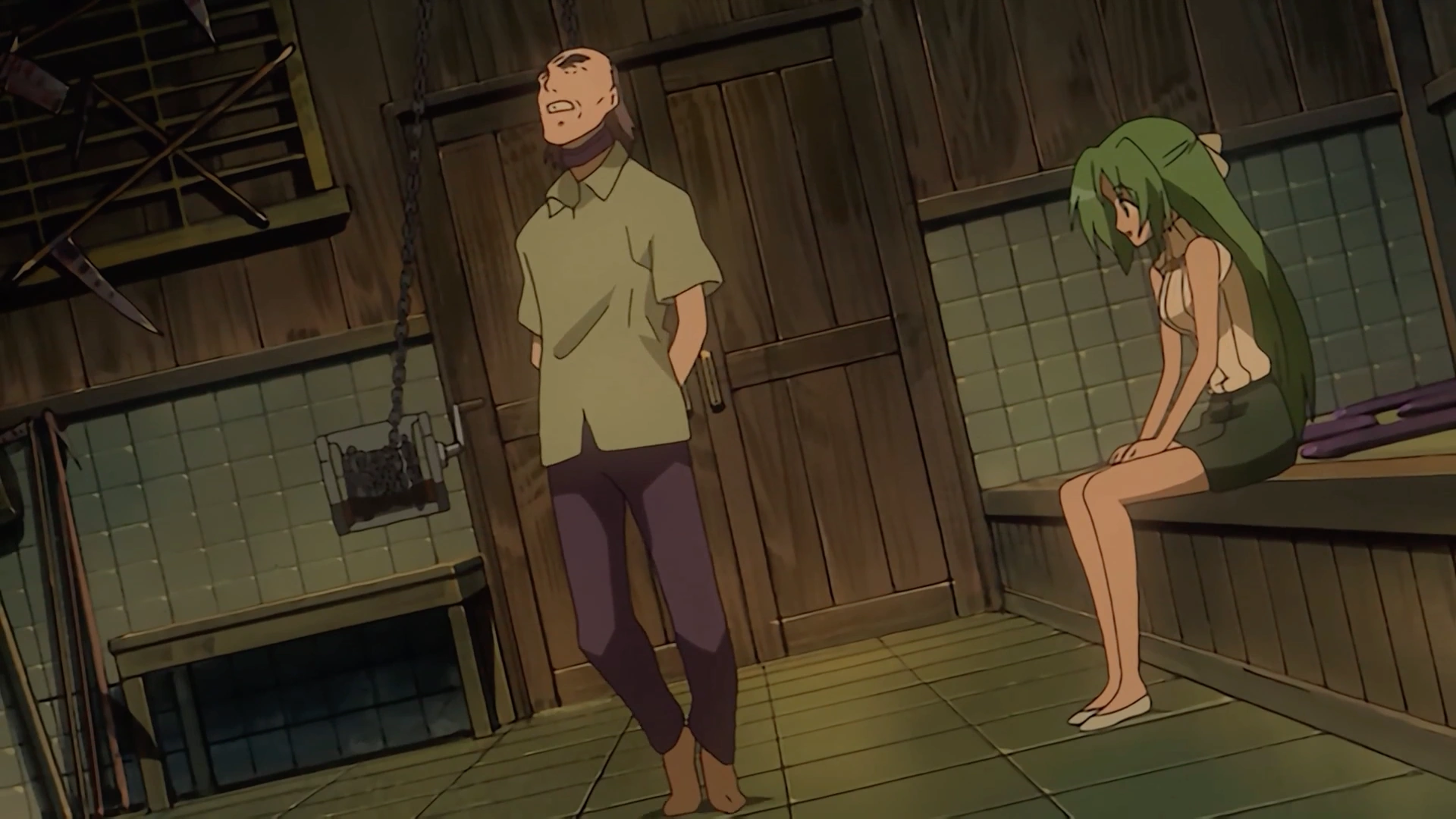 Kimiyoshi hangs from his neck with his hands tied and his feed just touching the ground in the Sonozaki torture viewing room. Shion informs him that the village is panicking at the moment searching for him. Shion offers to lengthen the chain, to allow him to stand easier, one space for each question he answers: "I think you'll feel better if the chain is three spaces wider."