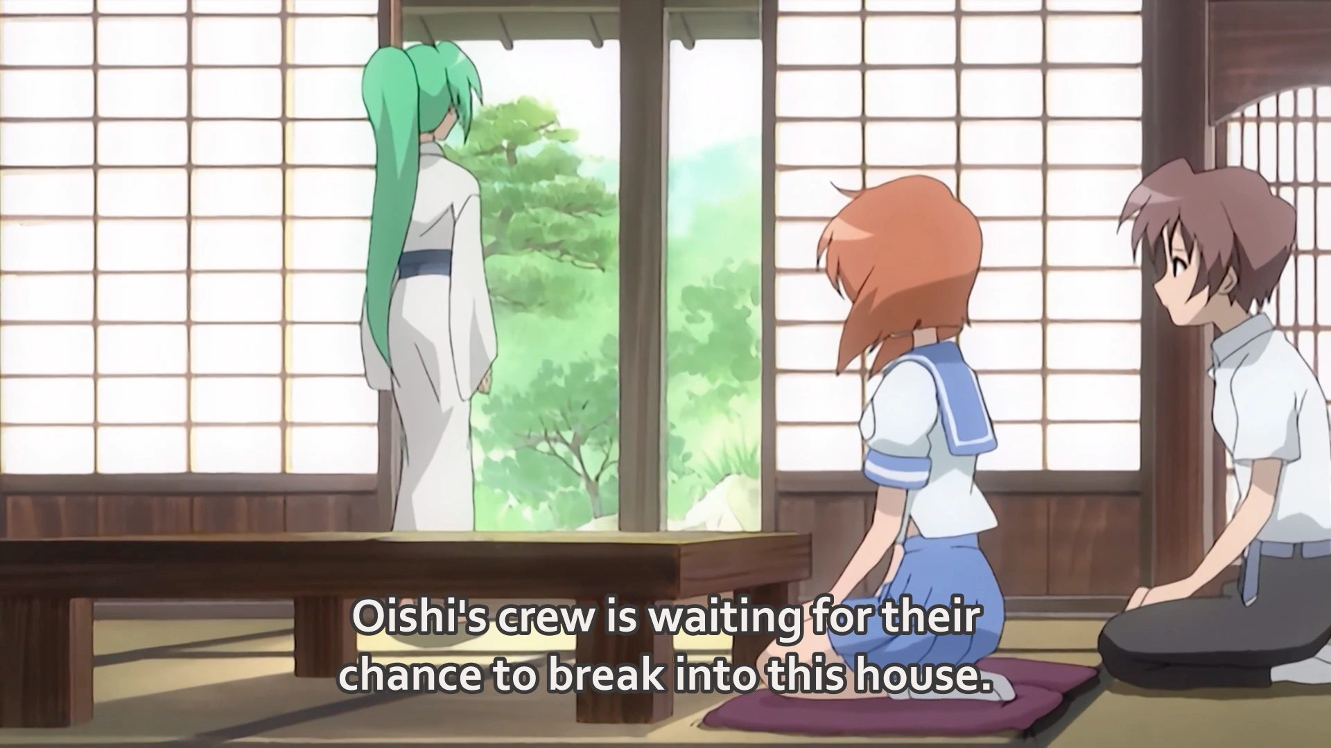 As in Watanagashi-hen, police vehicles are at the now opened doors to the bunker. Ōishi claims that the suspect has fled, as paramedics remove who everyone thinks is Mion on a stretcher. Keiichi is also carried out, with Rena accompanying him.