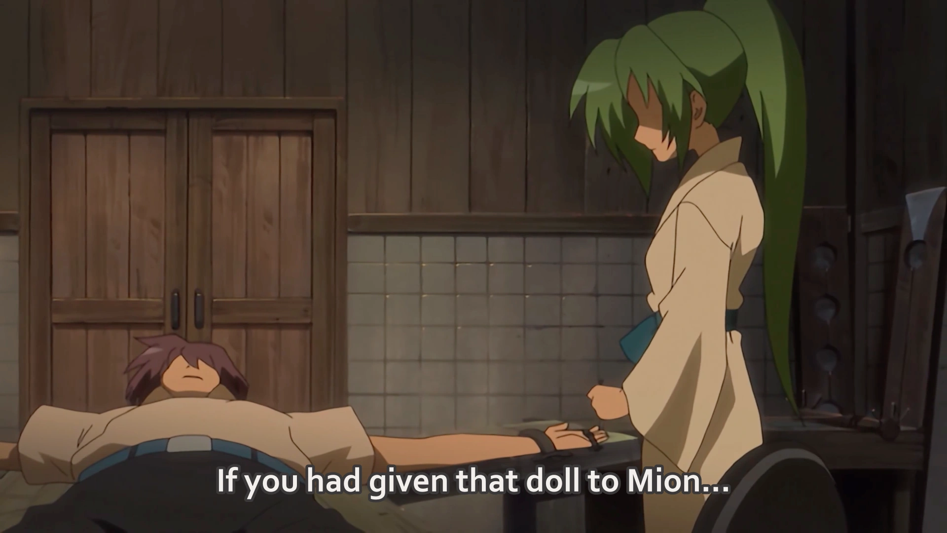 Shion informs him that she has had a demon within her for a long time. She has suppressed it with reasoning, and Shion felt that it may have gone away. As tears fall from her eyes, she recalls Satoshi patting her on her head the first time. She reveals that her demon was awakened by "one small thing": him. The scene flashes back to Mion confessing to her that Keiichi did not give her the doll.