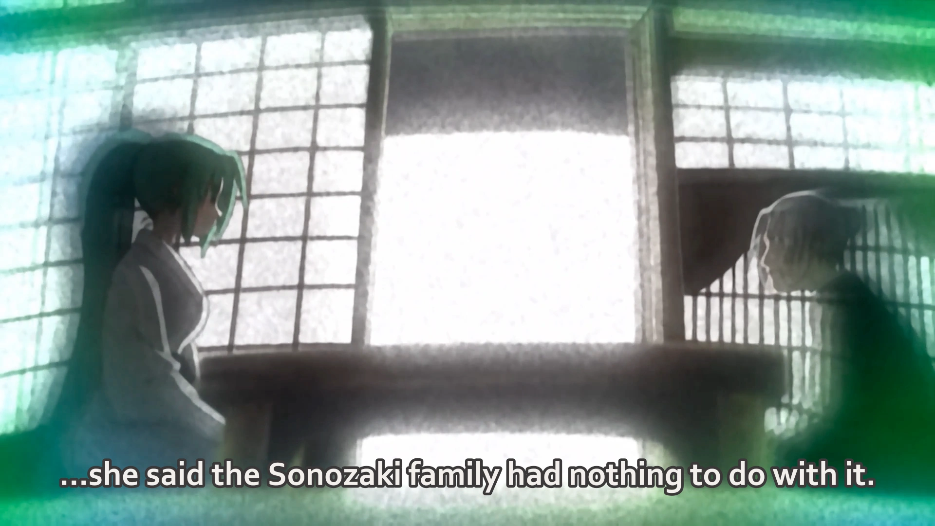 Over a flashback view of Oryō looking kindly, Mion reveals that she claimed the Sonozaki family had nothing to do with Satoshi's disappearance.