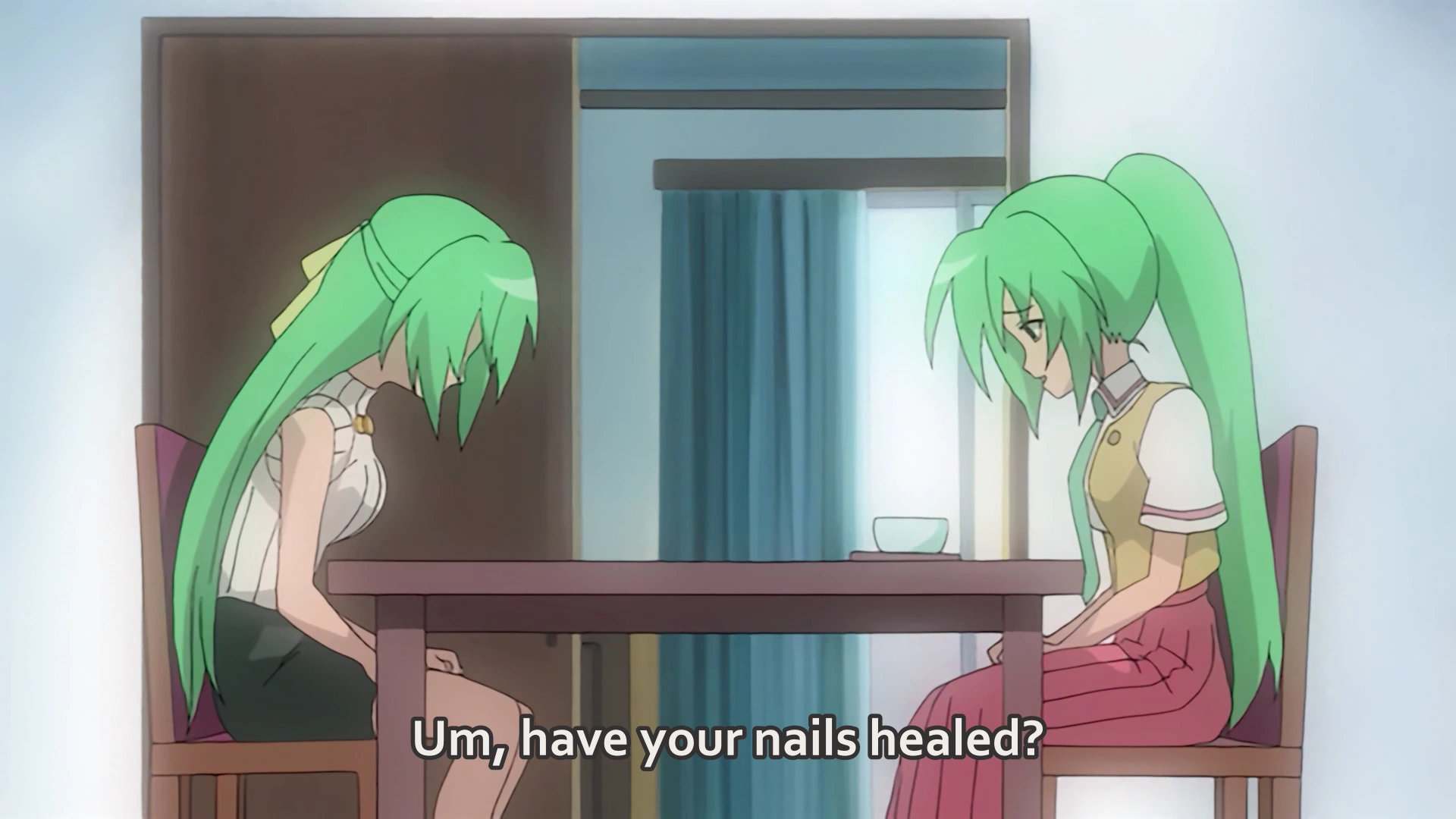 Mion compliments the apartment, but Shion does not answer. Finally, Mion looks at her sister and asks her how she is doing. Looking down, Shion claims her new school is "boring" as she suspected. Mion looks sad and both lower their heads. Mion finally asks Shion if her nails have healed.