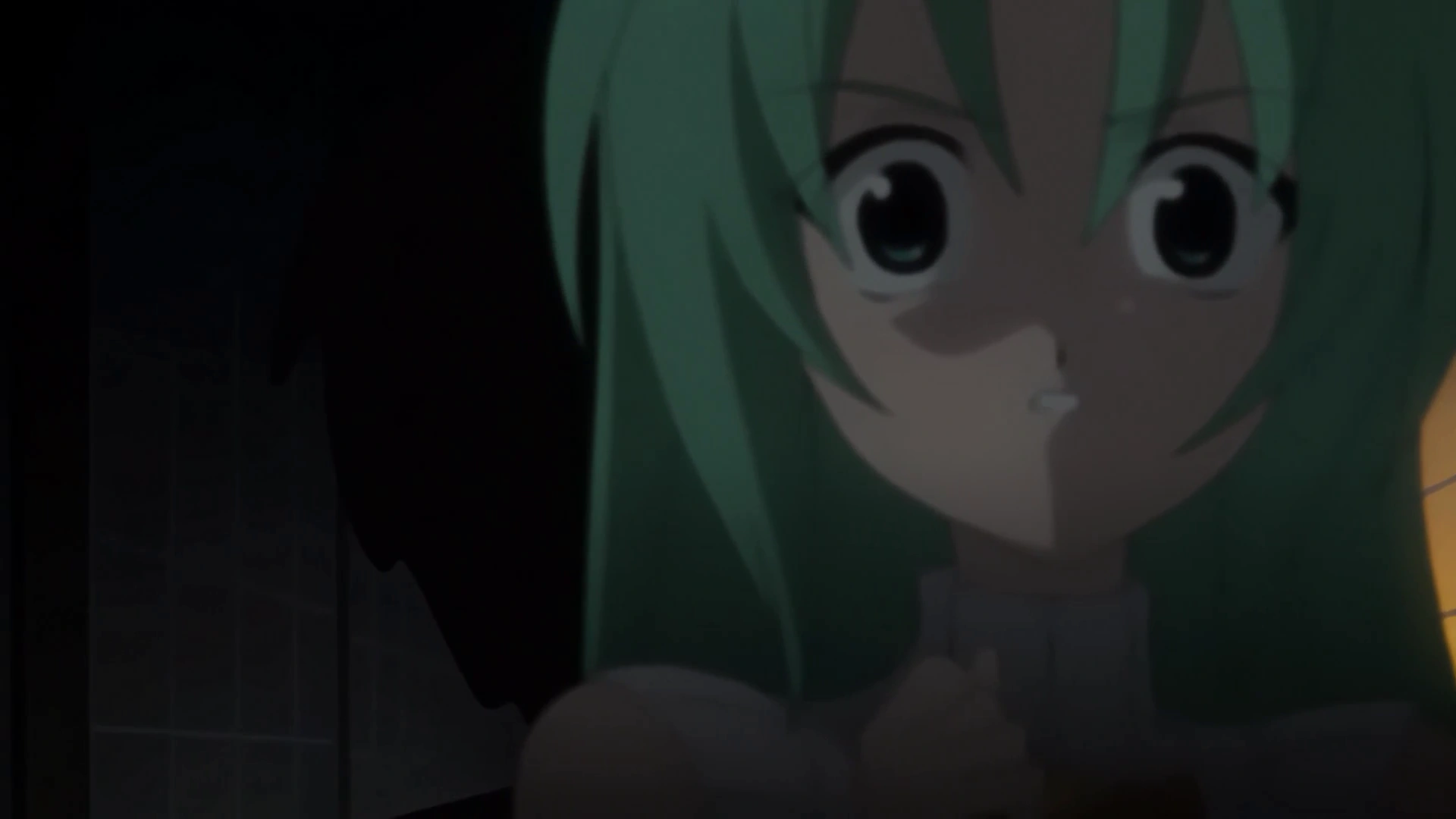 Takano muses about the serial deaths called "Oyashiro-sama's Curse." She repeats the formula: every year one person dies due to the Curse while another disappears as a "sacrifice." Surprised, Shion repeats, "O-one dies due to the curse, and another. . . ." She asks Takano what she means, and Takano pleasantly replies that the number of sacrifices must match the number of deaths. Miyo explains that she has been researching the "unknown history," the "dark history," of Hinamizawa.
