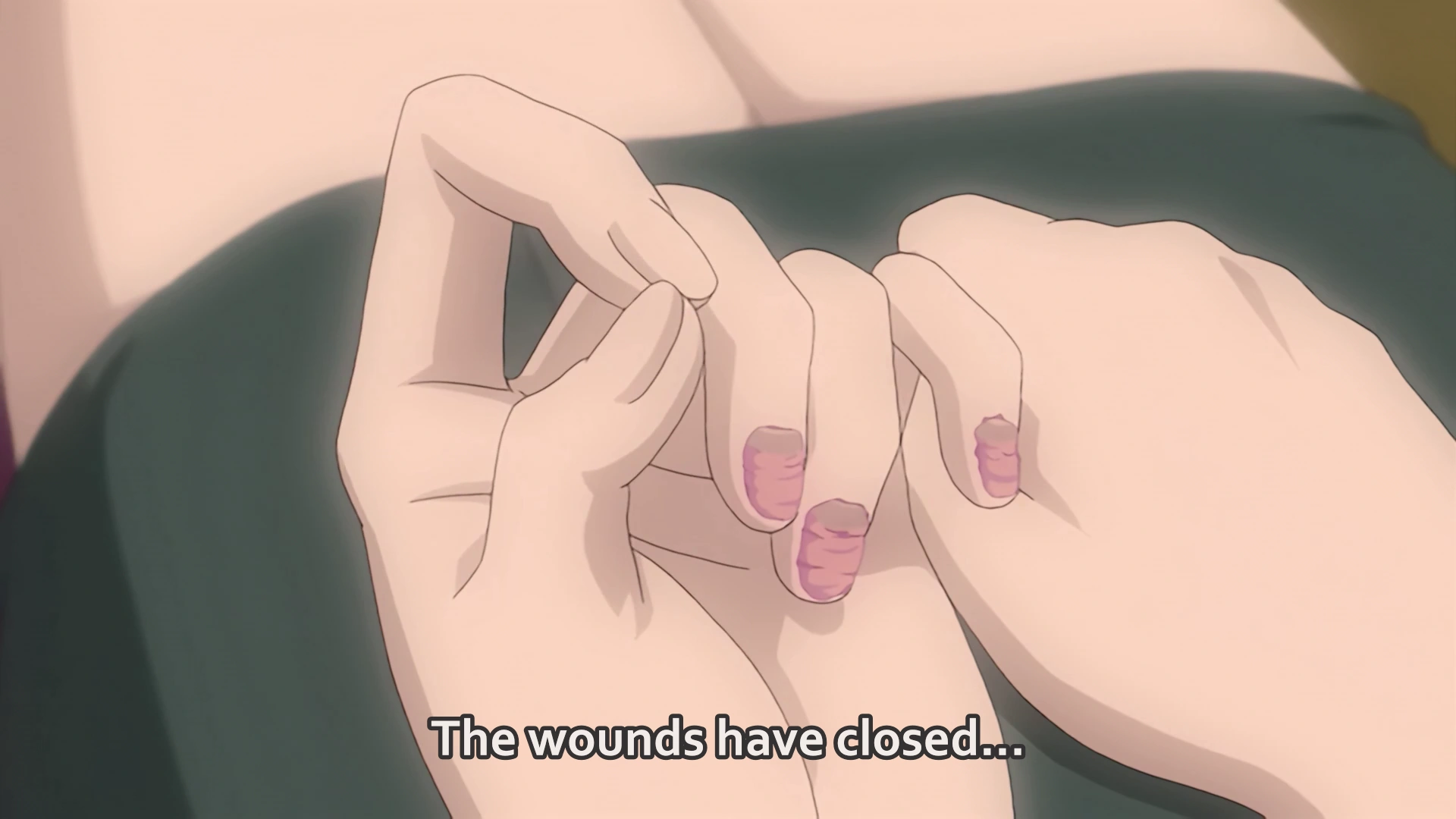 Shion clicks her thumb and index finger nails as she looks at the scabbed beds of her remaining fingers. She pleasantly announces that the wounds have closed, "but they're still crooked." She muses that she cannot really show them to anyone