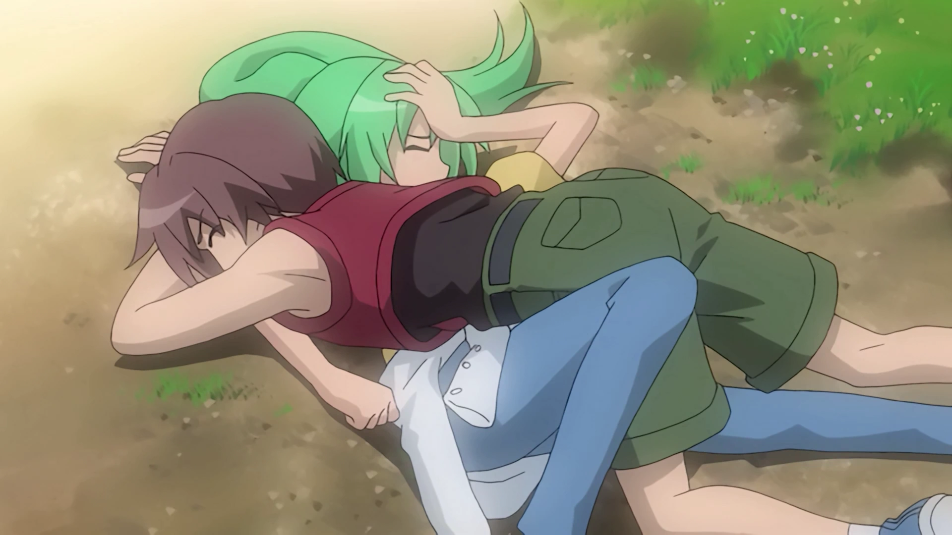 "That's enough!" she hears. A boy is a shadow in the sunlight. Shion at first sees Satoshi standing determined. She whispers, "Satoshi-kun?" as the figure reveals himself to be a smiling Maebara Keiichi.