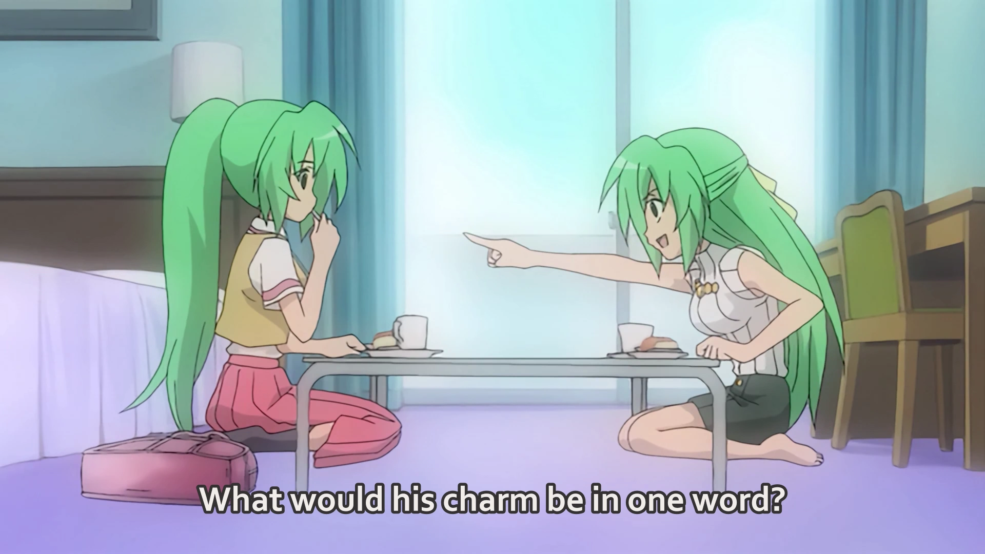Shion playfully accuses Mion of having a crush on Keiichi. While Mion still has her fork in her mouth, Shion demands that she identify Keiichi's charm "in one word!" Mion tries to laugh, but then in full sparkly-eyed anime girl, bubbles that it is how funny he is. She then excitedly starts telling story about a Club meeting at a toy store as Shion patiently listens. She narrates that she learned his name from Mion. She learned that he is a grade below her, that he just moved to Hinamizawa, "and Sis likes him."