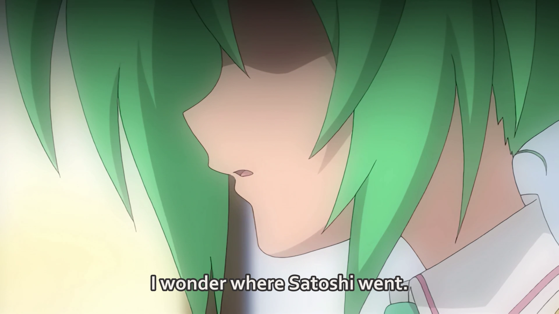 She turns, looks, and asks, "Satoshi-kun?" She smiles and concludes it was him.