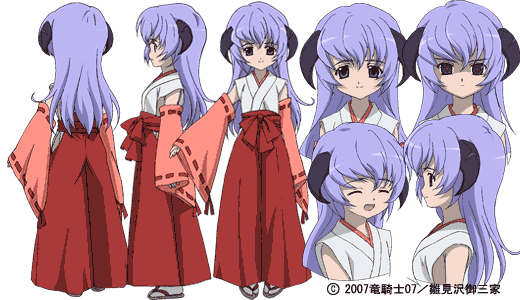 Hanyū's first form appears to be a floating, translucent young girl with lavender hair, dark violet eyes, and a pair of black or dark purple horns on her head (the left one is chipped slightly). When angry or channeling her god powers, her eyes turn a glowing red. In this spirit form, she wears an outfit reminiscent of one worn by a Shinto shrine maiden, with red hakama (long, split trousers), a white haori (kimono jacket), and a pair of long, pink furisode-like sleeves.