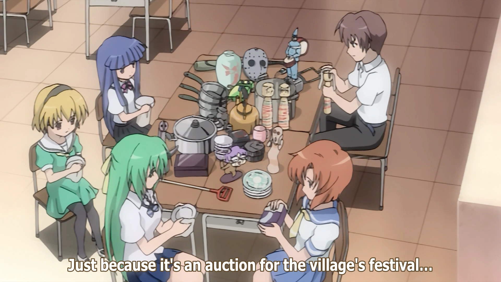 At school, Keiichi complains to Rena, Shion, Satoko, and Rika about having to clean objects for an auction for Hinamizawa's Festival which is just "old people getting rid of their stuff," as he accidentally breaks the head off of the doll he is polishing. He explodes into chibi cursing over how none of it will sell. Satoko scolds him that it will, and Shion encourages him to do his best for "Big Sister" (お姉・onee). On cue, Mion enters the classroom. She happily explains that larger pieces like furniture she had directly sent to the Furude Shrine.