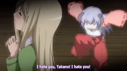 Behind her, a translucent Hanyū stamps her feet as she yells "That's not true!" repeatedly. She then begins stamping hard as she screams, "I hate you Takano!"