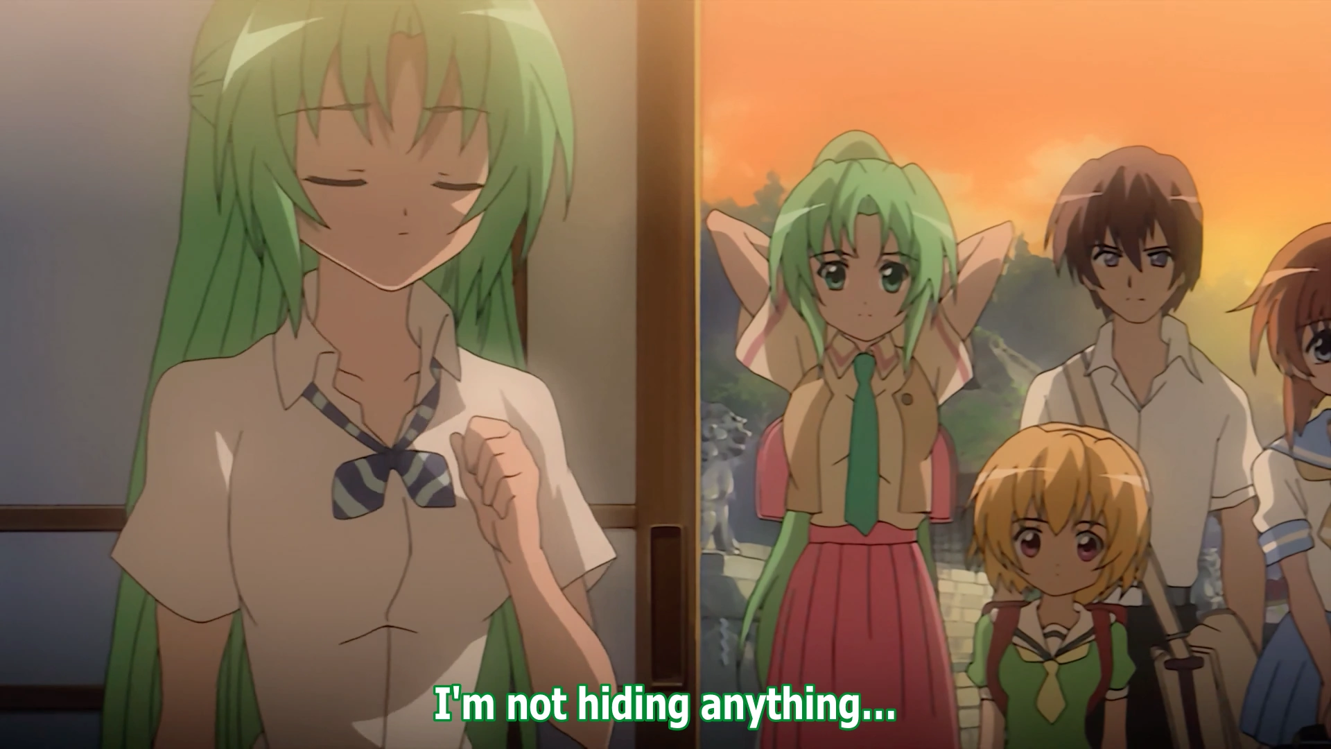 That night, in her Adult Voice Rika asks Hanyū what she thinks of the day's events where everyone remembered pieces of the past worlds while Satoko sleeps. Hanyū admits that such memories happened before individually, "but for everyone to remember all at once is quite rare." This gives Rika pause, and she narrates how each one of them, if they use their memories, may avoid the path to their tragedies over flashbacks of Keiichi murdering Mion and Rena, Rena's murder of Teppei, and Shion's murder of Satoko.