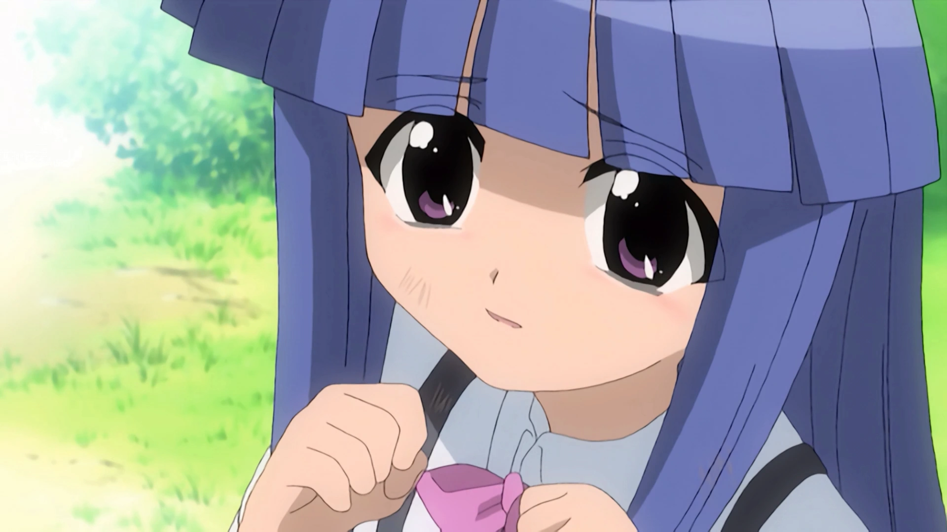 Later outside the school Keiichi waters the school garden and thinks about how Oyashiro-sama curse has occurred for five straight years. He recalls Takano Miyo with Tomitake Jirō asking if he believes in curses, then Shion claiming that if people are behind it, they come from Hinamizawa. Keiichi worries that if the curse is real, then he and Shion, who entered the Saiguden may fall to it. As he wipes his brow, he sees Rika sitting on the ground with tears in her eyes. He asks if she fell down, but she wipes her eyes, tells him not to mind her, then gives him a hug. "Before that," she asks, “Did you do something bad on the night of the festival?” Shocked, with his heart pounding, Keiichi cannot answer, but Rika insists. She releases him, smiles, then apologizes for asking him such a strange question, requests that he forget it, then runs off. Keiichi calls out to her, and she turns and looks at him. As he remembers what he saw of her ritual dance, he tells himself that he wants to tell her the truth, but he fears that because she is the shrine maiden, she will never forgive him.