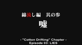 At home in bed, Keiichi regrets confessing to Rika, even metaphorically. He wonders how she spoke in detail as if she was there. His father knocks on his door to tell him he has a call from "Sonozaki-san." The other voice identifies herself as Shion. He apologizes for his previous blaming her for their predicament; she forgives him if he regrets it. She suggests that from now on they should inform one another of each of their concerns since they share the same destiny. She mentions the disappearance of the village headman and reveals that the night before she confessed to him what happened. She cries that it is her fault he disappeared. While she repeats that he was "killed because I told him everything," there is a grainy montage of Rika's hair moving in the wind, a blood drop bursting as it hits a surface, Rika's left hand behind her back with her index finger pointing downward, then Rika lying with blood staining the left side of her school shirt and skirt. Keiichi confesses he, too, is at fault since he told Rika, and he stands up.