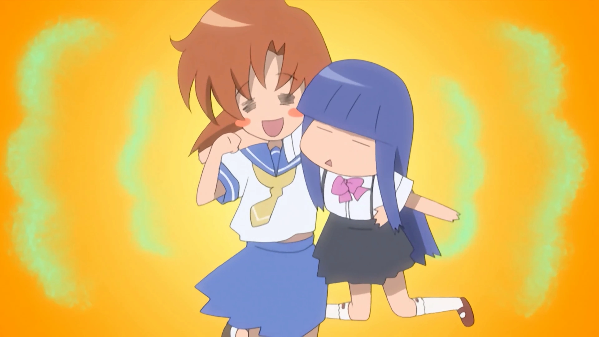In the classroom, a number of young students fearfully whisper to one another. Rika suggests that "maybe he got lost," like she once was. Rena shrugs, turns chibi, and thinks being lost would be "nice." She immediately enters into her Cute Mode to お持ち帰りぃ Rika. Keiichi suggests that since "he" is "old," "he" might be wandering around due to senility. Satoko insists that the village headman is lively and teaches both calligraphy and kendō. Keiichi ask them and Mion if it is Oyashiro-sama's curse. She looks down. To himself, Keiichi notes that the headman left for a meeting at the Furude Shrine's meeting room at half-past noon the day before, and the meeting ended well after sunset. He has not been seen since.