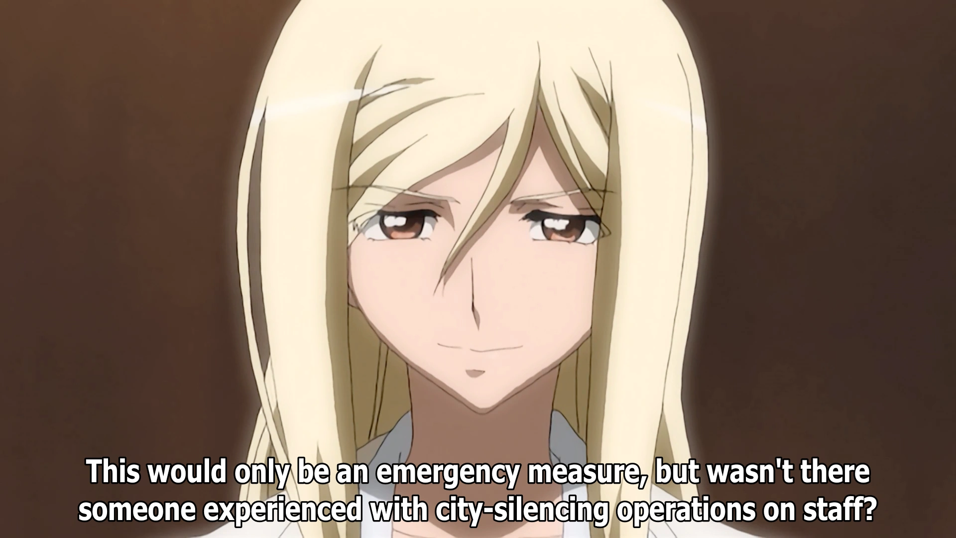 Takano explains to the men sitting around a table in a conference room that her and her people believe the paranoia and feelings of danger will lead to violent self-defense behavior. The men discuss the implications of this. Man with Mustache visibly sweats as he realizes that after something happens to the "Queen," they would have 48 hours before the infected begin to behave violently. Takano rhetorically asks if she has their approval. Man with Gold Tie slaps Hifumi's paper and declares that they have no choice. Takano smiles as she listens to the men discuss and agree to emergency measures made to appear as if a natural disaster occurred. Takano narrates that the men are looking at documents they once trampled. Inwardly, she urges them to read and tremble "at the truth within!"