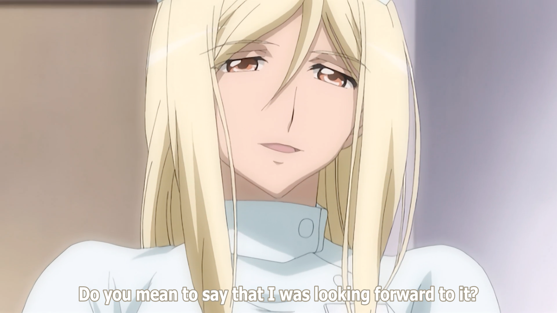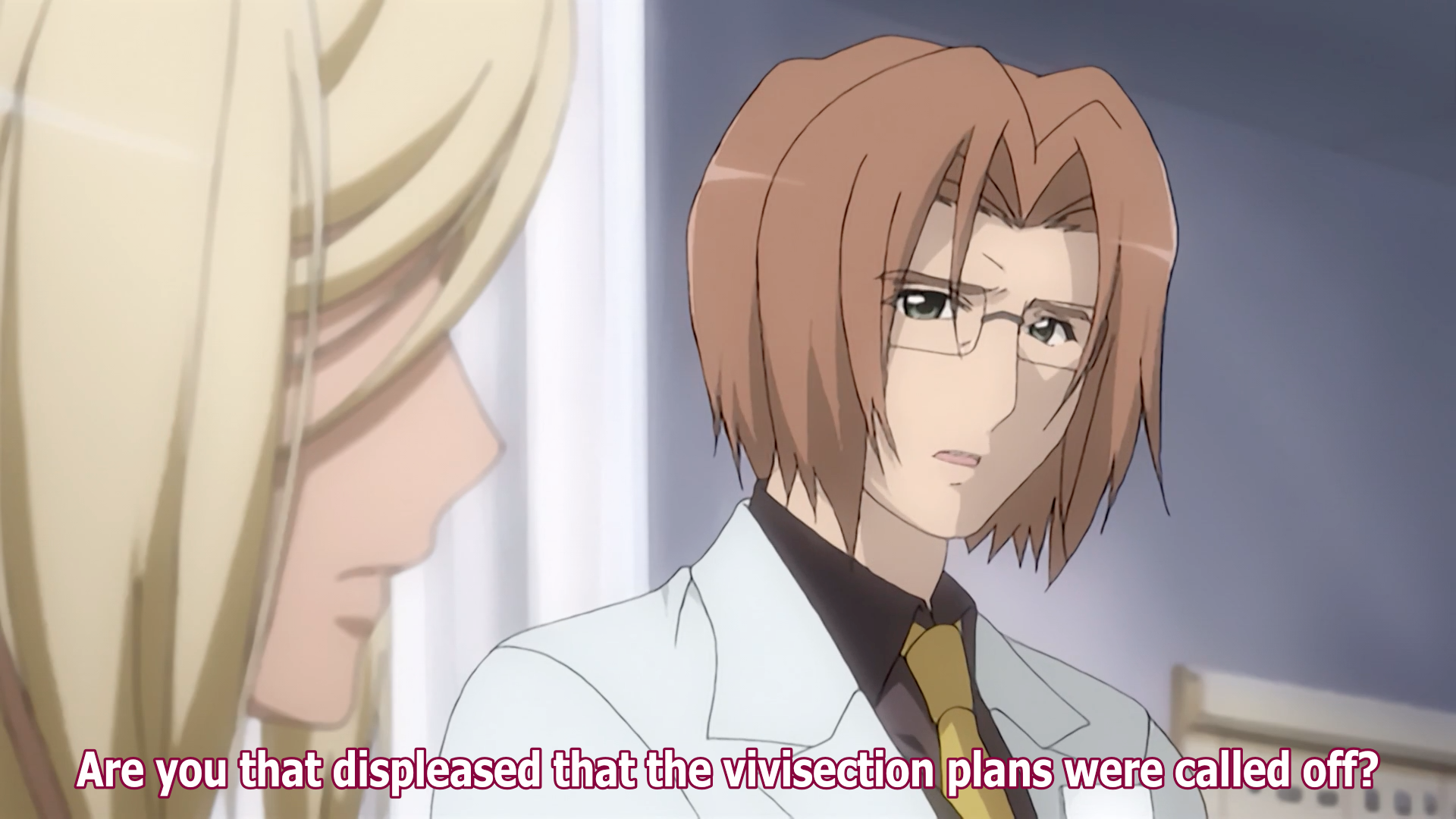 notes it was his father who, "committed multiple irrational acts of violence." Irie angrily retorts that his father suffered a head injury. Takano condescendingly notes that no one believed him and accuses him of continuing his research to clear his father's name. She giggles and turns to walk away. Irie demands to know what she means. Takano sits on the examination bed and laughingly wonders why, with such a wonderful goal, he still has scruples. They then argue about guilt and logic, with Takano claiming that to ask for the consent of Rika's parents was nothing more than his hypocritical excuse. She ignores his protest to remind him that progress happens through the challenge against the era's morals and values: "A strong conviction and an unwavering iron-clad belief alone bring about results." She also reminds him that his hands are already stained with blood. He accepts this, but he reminds her that he wishes to harm as few as possible. Takano sniffs at this. Irie turns his back on her and instructs her to prepare Rika for her next examination. Takano sarcastically responds, "Understood, Chief."