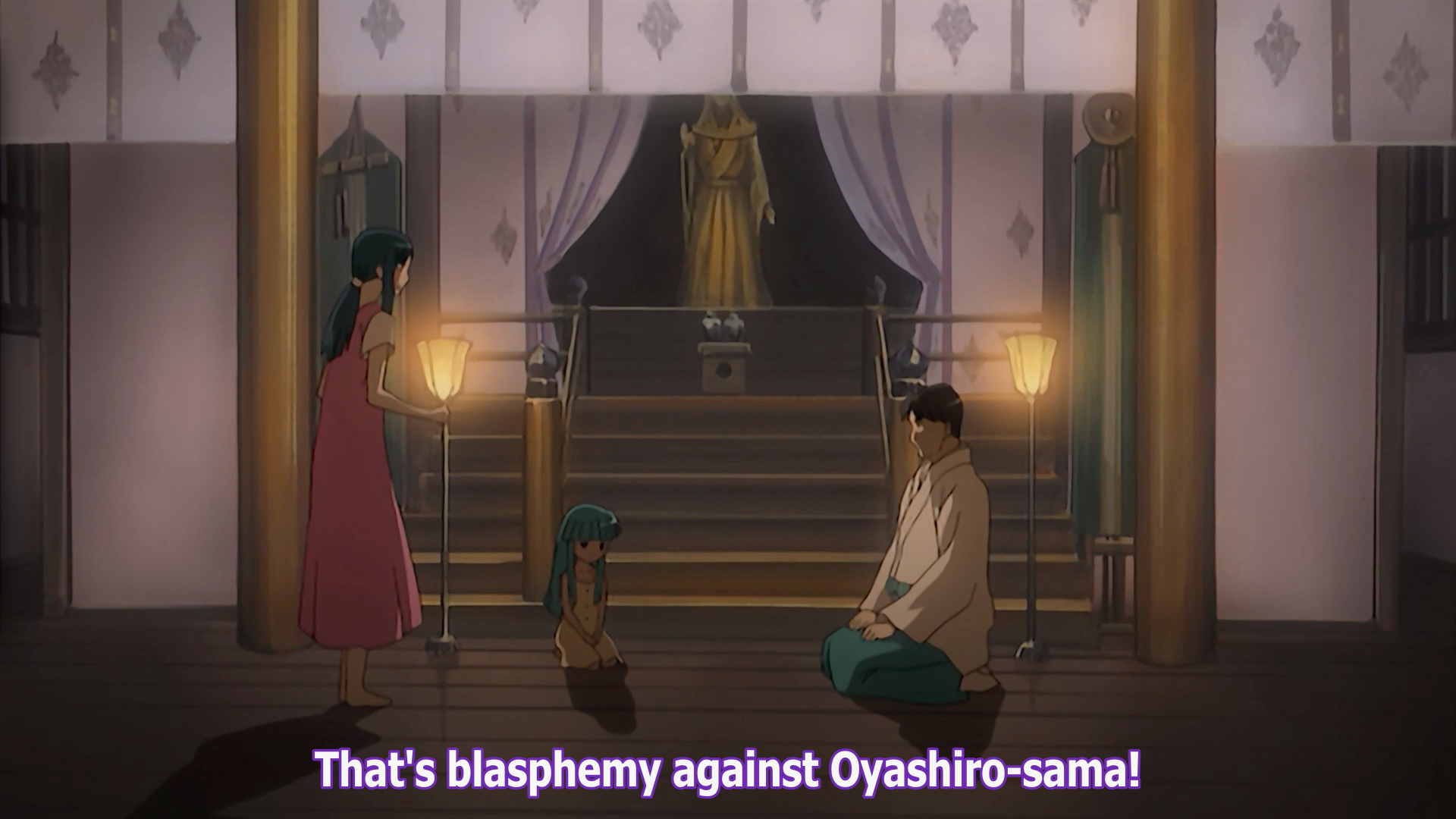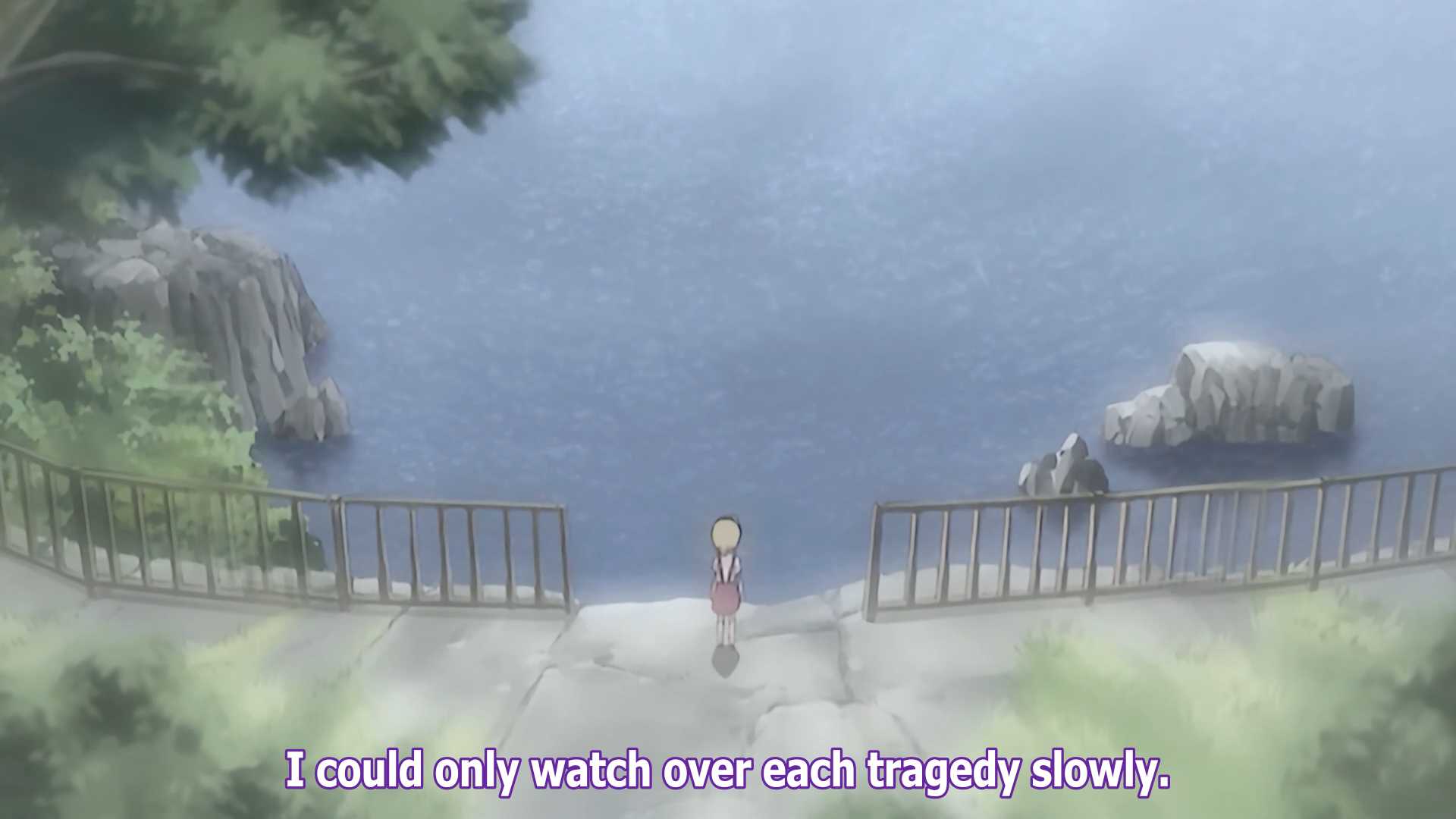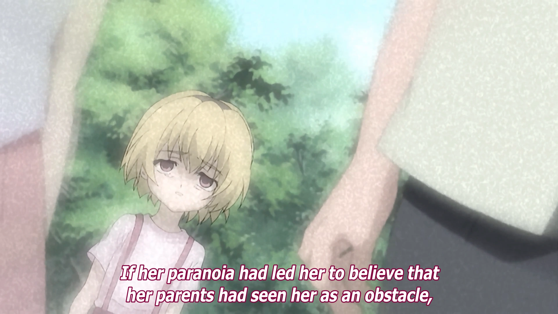 The episode opens with a flashback. The viewer's viewpoint is that of a child rushing towards a man and a woman standing at the fence at the edge of the Furude Shrine observation area. The voice-over is Hanyū stating that she "couldn't do a thing," as the child pushes the man and woman through the fence and over the gorge.