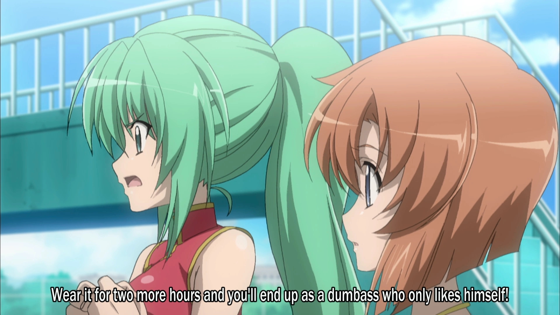 Mion explodes, telling him that he will end up as a fool who will only love himself. Keiichi invites her to use "force" to remove them if she wishes as he dives into the pool. Rika finds Keiichi becoming engrossed with himself "interesting. Nipaa~!" Rena protests that it is not "healthy at all! Hau~!" Satoko observes slyly that since Keiichi declared that he would not take them off, the forceful removal of them would fit the spirit of The Club. Rika agrees with "exposing Keiichi's little brother in the pool," as Mion stares ahead sternly, and Rena blushes and smiles.
