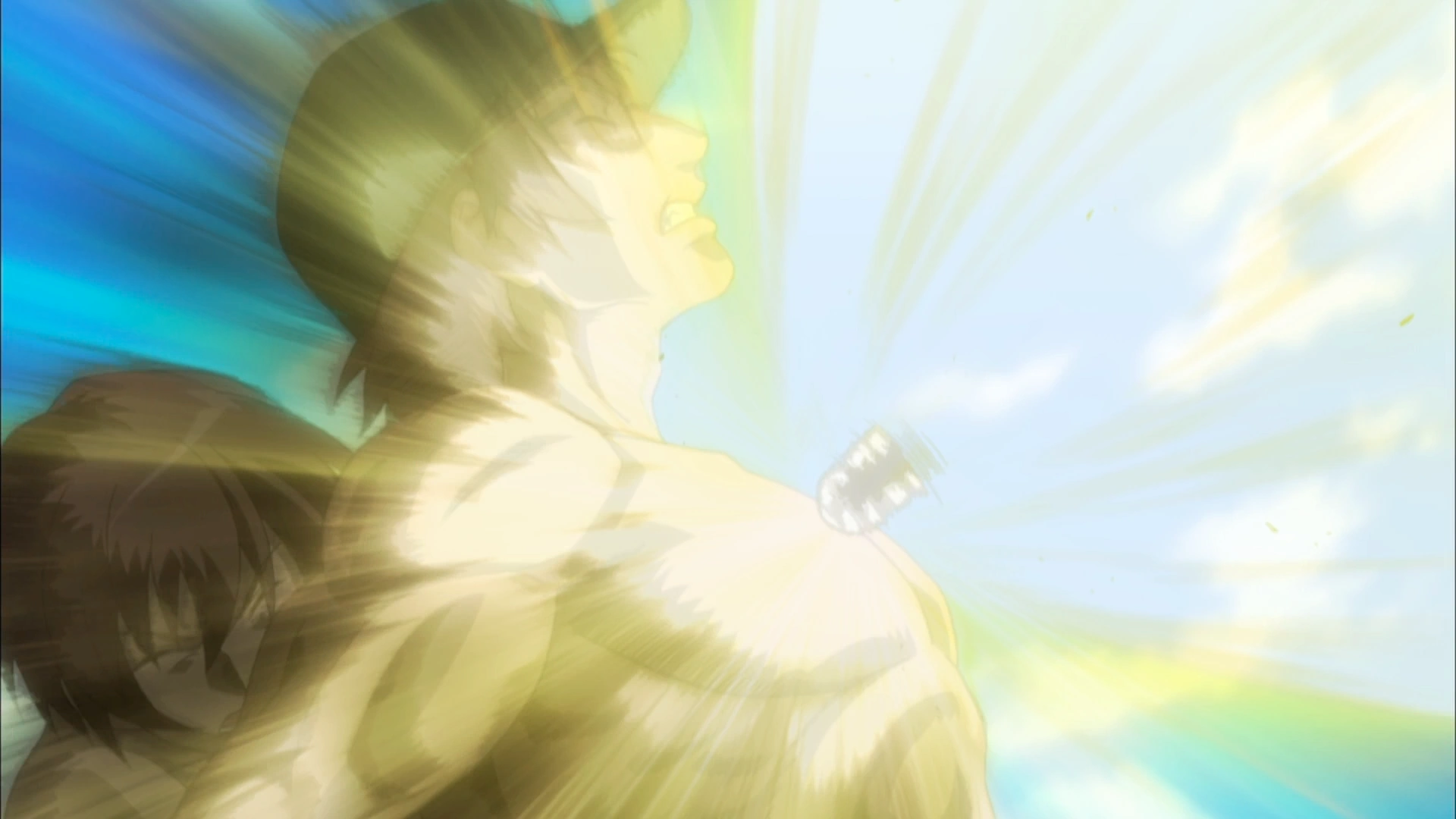 Suddenly, and with sparkling teeth, Irie Kyōsuke appears out of dramatic anime heroic central casting to encourage Keiichi to pursue his dreams, to be followed similarly by Tomitake Jirō, then Ōishi Kuraudo. Keiichi turns to find the three improbably arriving on surfboards. Jirō explains that they are men who have always wanted to be popular. Declaring themselves with Keiichi the "Soul Brothers," Irie explains that once Keiichi absorbs the magic, he can pass the trunks onto another. With anime drama, posing, and sparkles, Keiichi joins them.