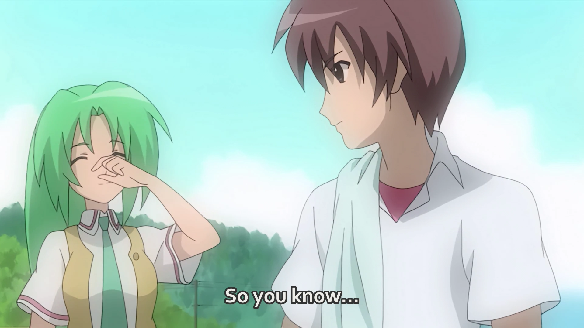 At school, Keiichi washes his face outside. Mion greets him, and he remarks that she does not look well. She confesses that she was dragged to a family dinner while making a gesture that indicates she drank. Keiichi scolds her for underage drinking. Mion laughs then turns serious to ask if he saw Jirō and Takano the previous night. As he sweats, Keiichi claims that he does not remember. She then asks if he saw Shion. Keiichi reminds her that she asked him that same question the night before. Mion laughs it off by slyly suggesting that she thought she might get a different answer. While Keiichi finds this surprising, Mion happily announces that she will relay that he was not "involved in anything bad," then runs off.
