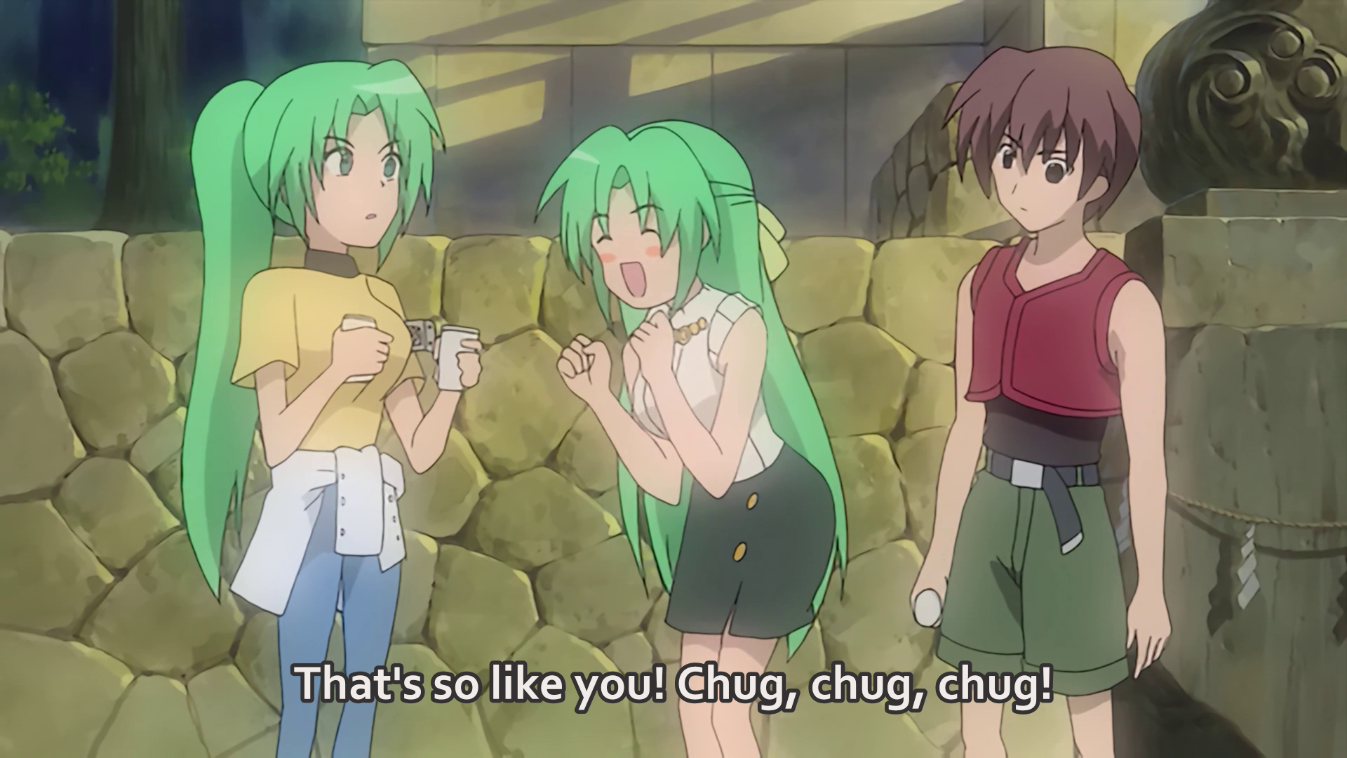 Keiichi is given a break from his help setting up booths for the Watanagashi Festival. Exhausted, he is offered a drink by Shion, whom he accidentally calls "Mion." He screams about what she did to him a previous day, but she slyly chides him that it was his mistake. As he concedes defeat, Shion offers him some barley tea as an apology, but just as he is about to drink it, Mion interrupts them, causing the tea to fly into his face. In the midst of their sibling argument, Shion wonders why Mion carries two cups of barley tea. After all, Shion notes, such a "rough" and "self-centered" girl like Mion would never bring tea to a boy. Unable to admit she brought tea for both Keiichi and herself, the blushing Mion declares that she was "really thirsty" and brought two cups for herself. Shion encourages her to drink both. A chibi Mion chugs both then coughs. A similarly chibi Shion claps and sarcastically congratulates Mion. Mion declares that she hates Shion, "even more than the other day!"