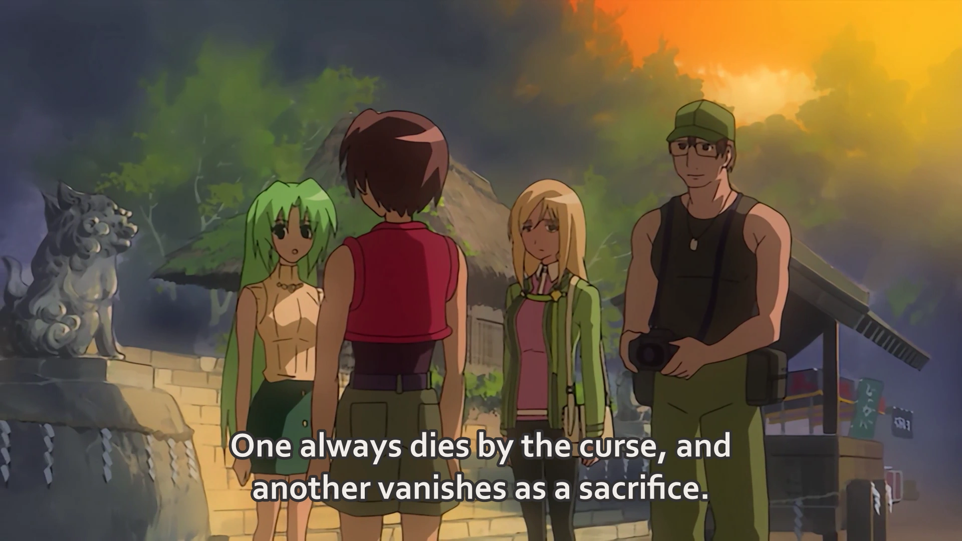As the Sun sets, Shion wonders which person will die and which person will be taken. Keiichi turns to Shion, who is walking next to Takano and Jirō, what she means. Shiom asks Mion if she has not explained it to Keiichi. Mion claims that she does not "talk about such things," then tries to take Keiichi by his hand to lead him away. However, Keiichi stands firm, removes his hand from hers, and he asks her about it. Mion then declares she will go on without him, but if they do not hurry, there will be no food left for them. After she leaves, Jirō asks if Keiichi knows about the dam project. Keiichi does know the plan would have submerged Hinamizawa. Jirō continues that a local protest opposed it, with the office set up at the Furude Shrine. In turn, Shion, Takano, and Jirō explain the curse of Oyashiro-sama also known as "the Series of Mysterious Deaths": every year during the festival one person dies, and another disappears. Takano rhetorically asks if the cases are neither a curse nor coincidence, what can they mean? Jirō explains that Takano has concluded that the curse is not supernatural but is in fact a series of either planned or coincidental murders caused by humans.