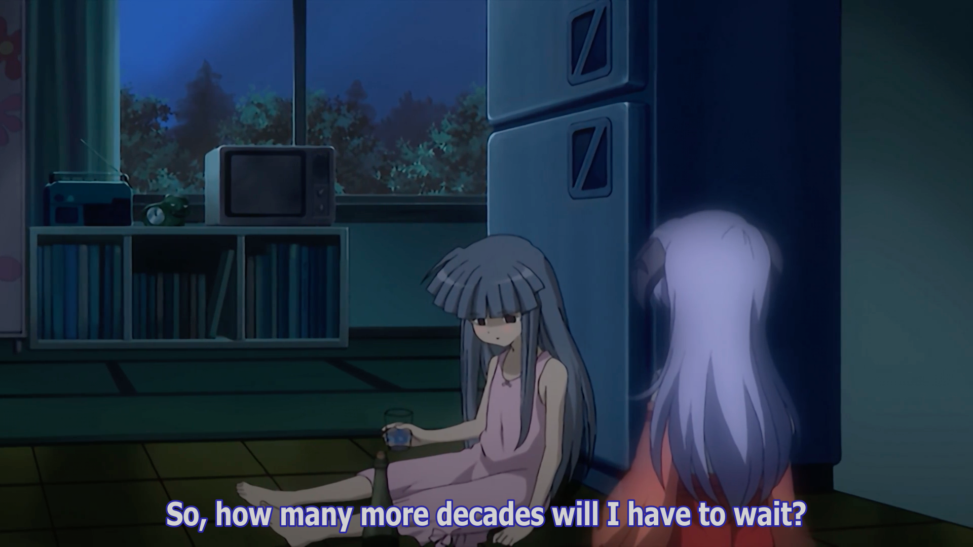 Rika asks her just how many more decades she needs to wait: "How many more times will you ask me to repeat a mere two-week world?" Rika smiles and confesses that it is impossible since she will go crazy before she ever reaches to promised "happy world." She lays down on the bare floor and announces that she no longer cares about any world. Hanyū can only whimper in sad sympathy as Rika falls asleep on the floor. The next day in their classroom, Rena, Keiichi, Mion, and Shion with other school children and their teacher Chie stand around Satoko's empty desk next to a dejected Rika. Rena asks her why Satoko is absent. Keiichi asks if she is sick. Shion "begs" her to tell her if something has happened.
